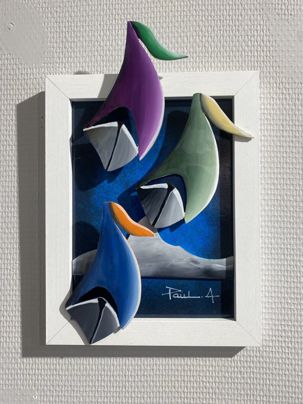 Cap Petit format, grand plaisir! Sur un fond bleu azur, 3 bateaux s’échappent du cadre, comme portés par le vent. Entre peinture et sculpture, ils semblent flotter mêlant ainsi le rêve, l’horizon et la liberté. Une œuvre qui vous invite au voyage ! Les « Mini Enjoy » sont des pièces uniques, pleines d’énergie et de couleurs……