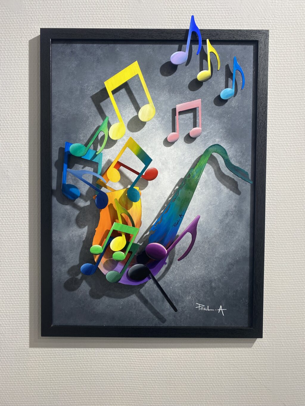 Saxo Pop L’explosion musicale ! Une explosion de sons et de couleurs ! Le saxo s’anime, libérant une pluie de notes qui s’échappe pour vibrer dans l’espace. Chaque couleur devient une note, chaque relief devient une pulsation. Entre musique et peinture, « Saxo Pop » célèbre la joie, la liberté et la folie… là où le geste…