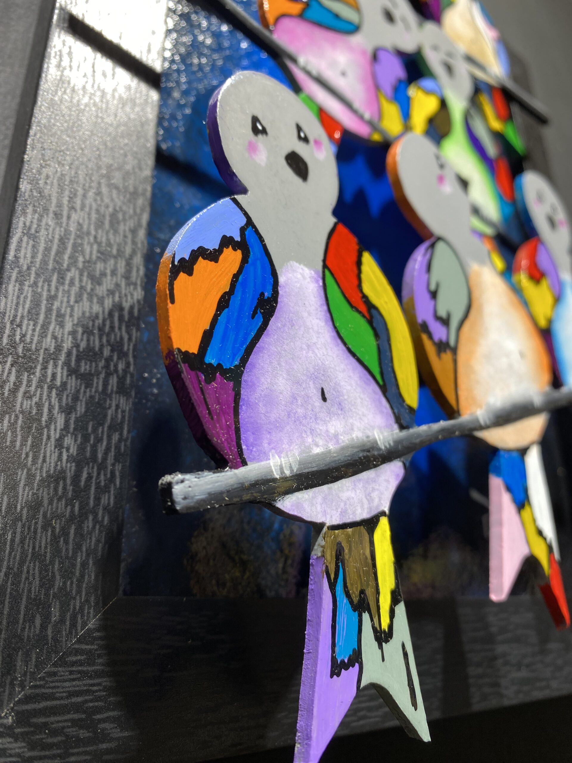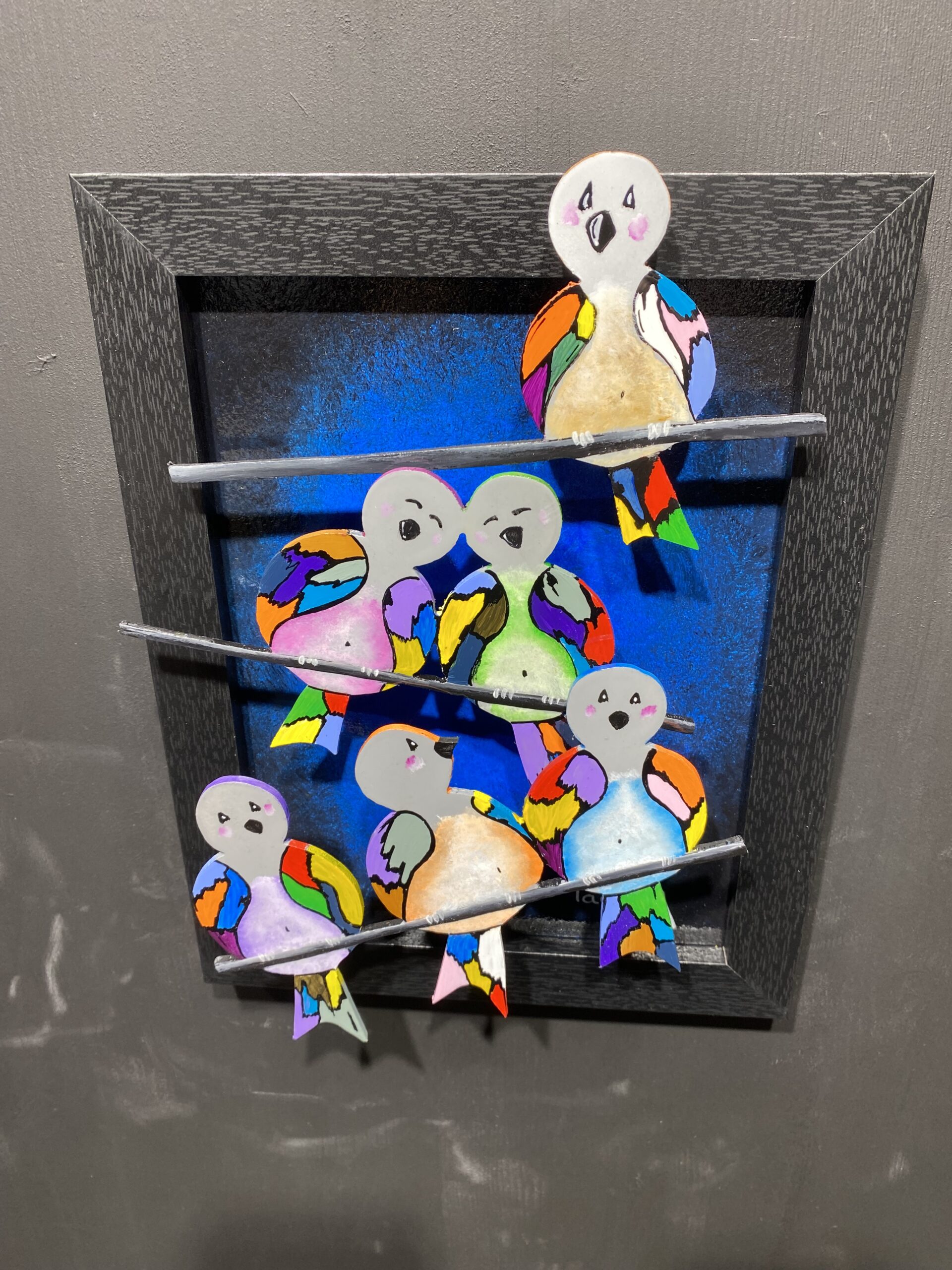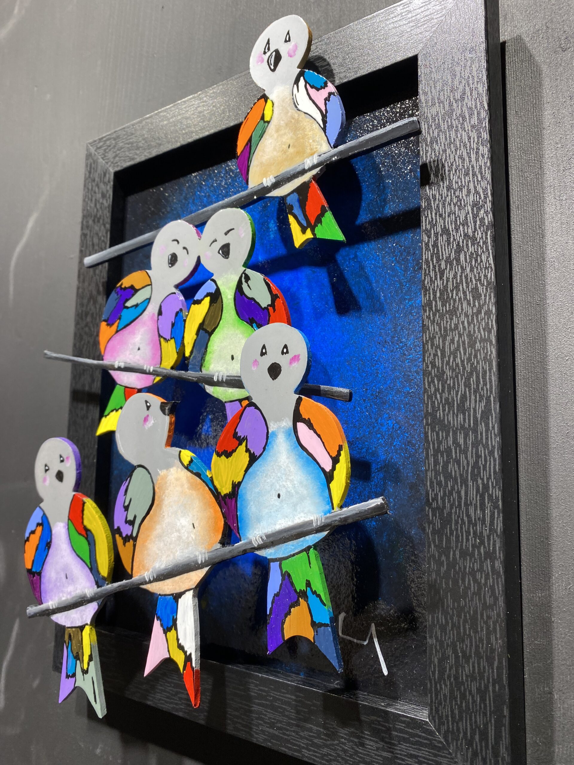 Le relief donne vie à l’ensemble: Les oiseaux ne sont pas simplement posés… Ils existent, ils dialoguent, ils chantent et ils piaillent. Bref, c’est joyeux et c’est la vie !