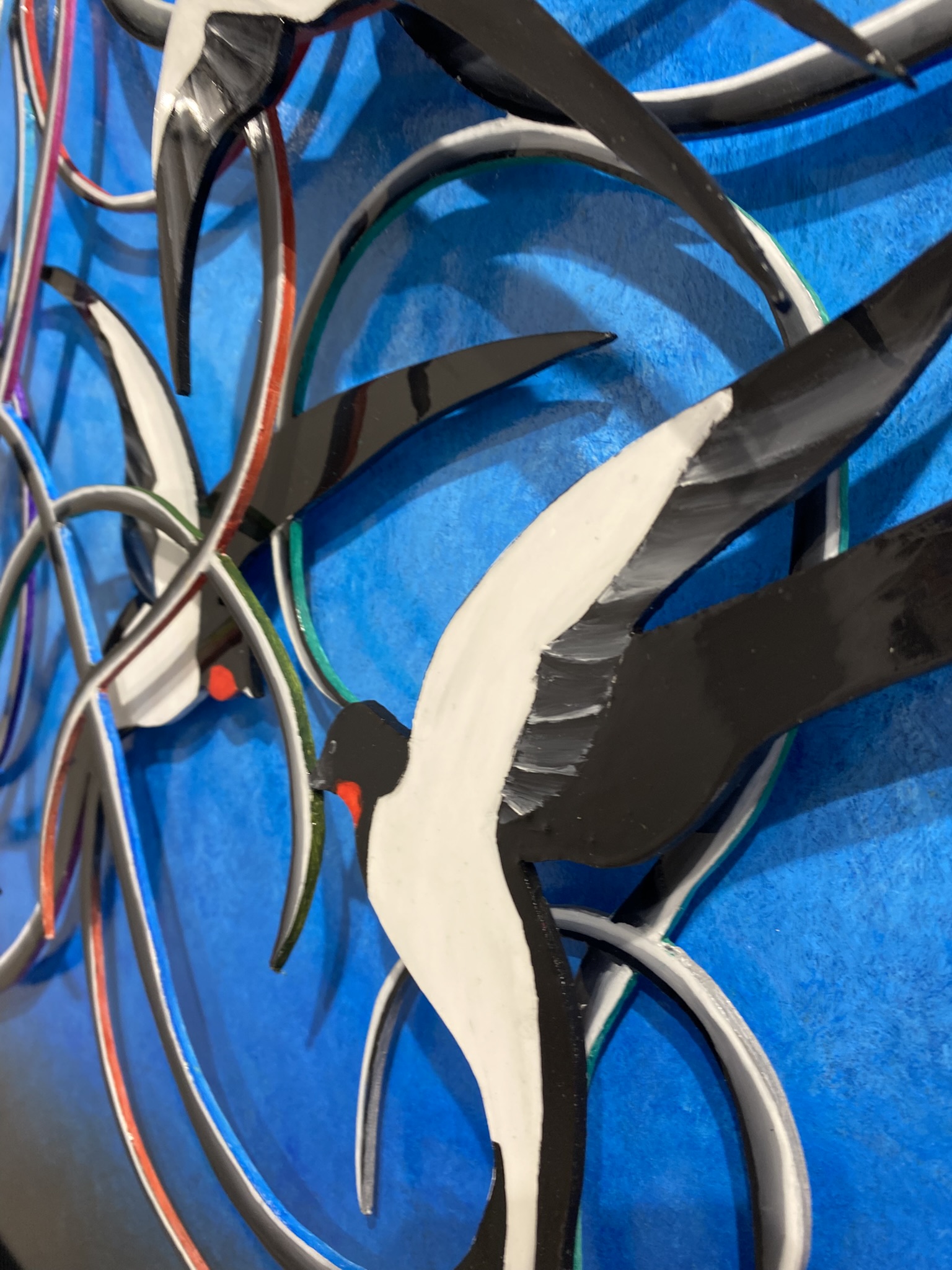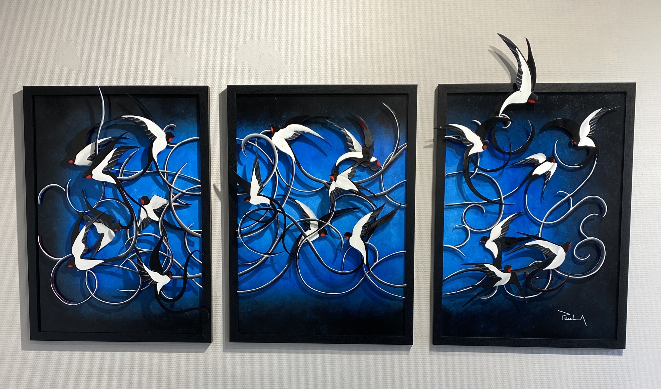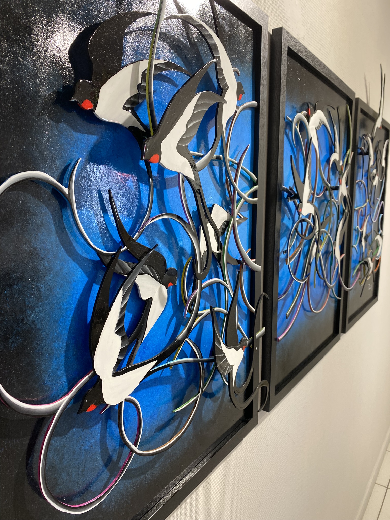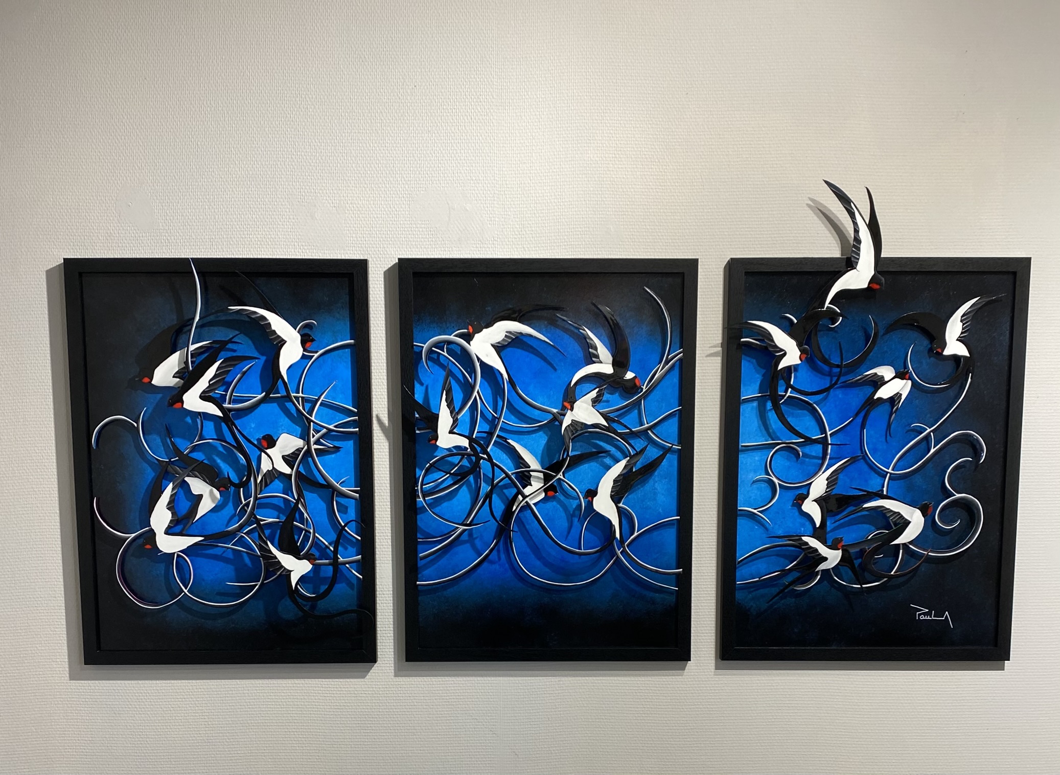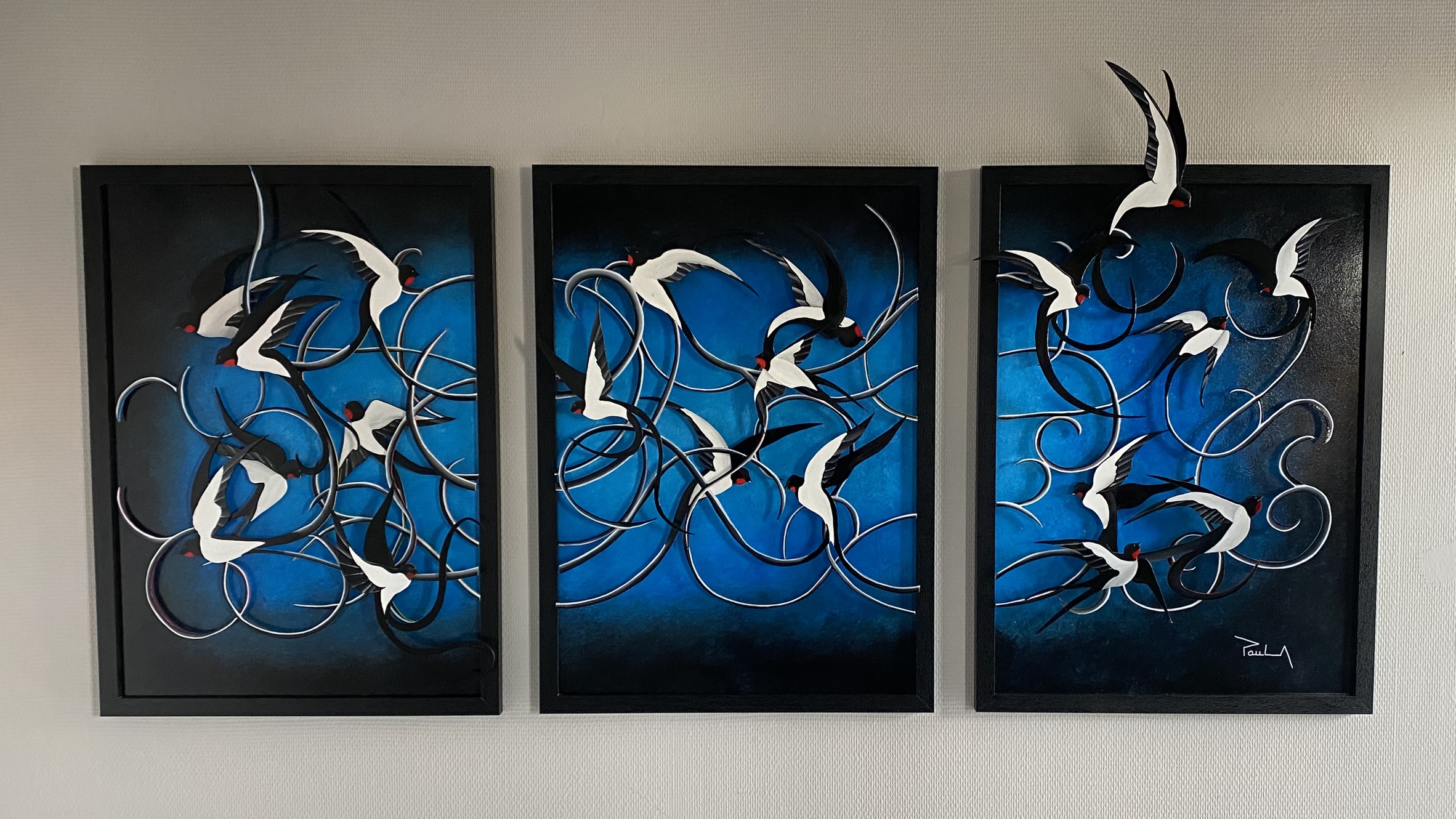 Sur un bleu profond, les oiseaux s’élancent et traversent les 3 panneaux en un seul souffle, guidés par des courbes sculptées qui évoquent des rubans de mouvements. Chaque ligne semble capturer l’élan d’une aile, l’inflexion d’un virage, l’instant suspendu d’un vol libre.