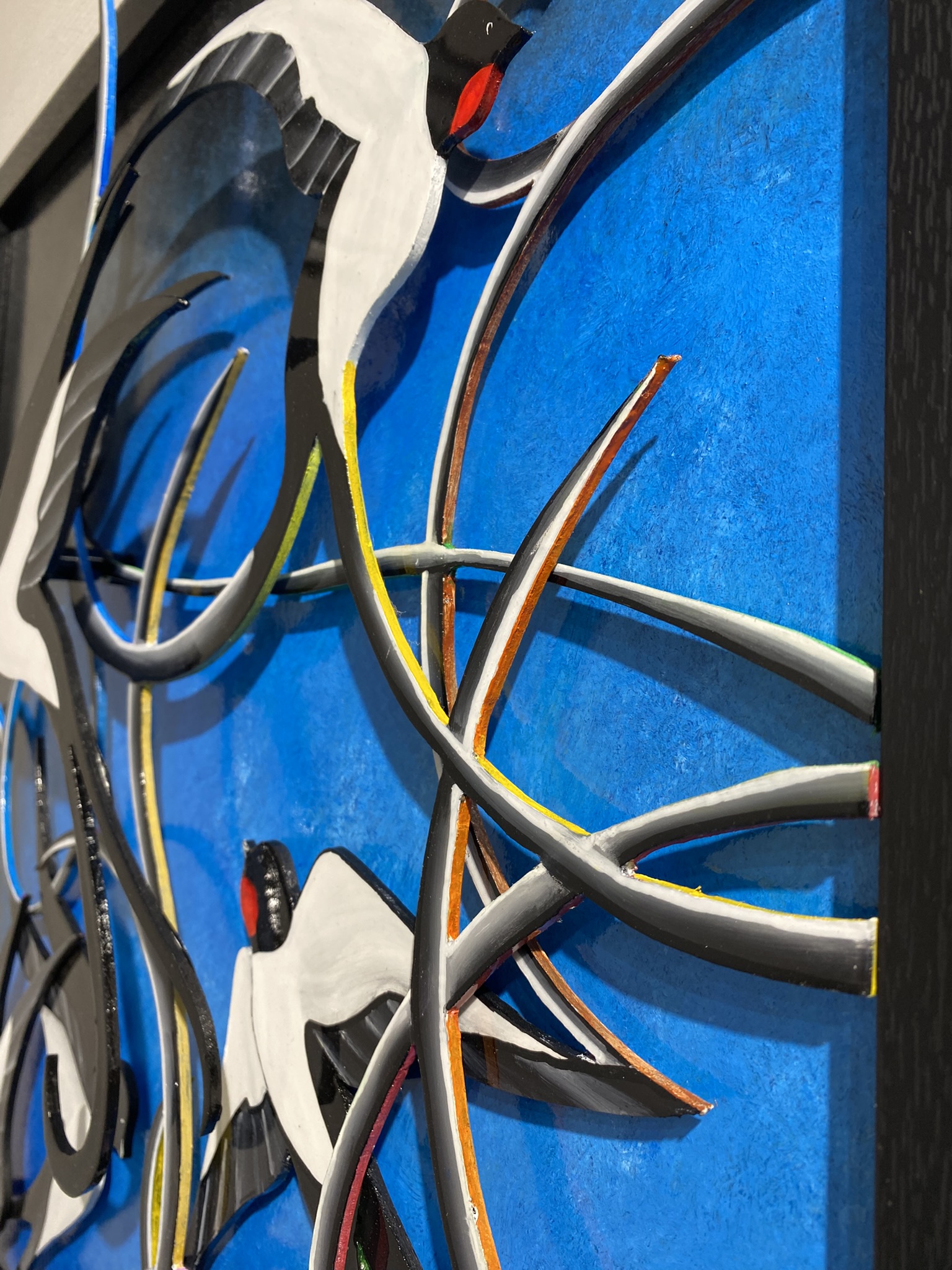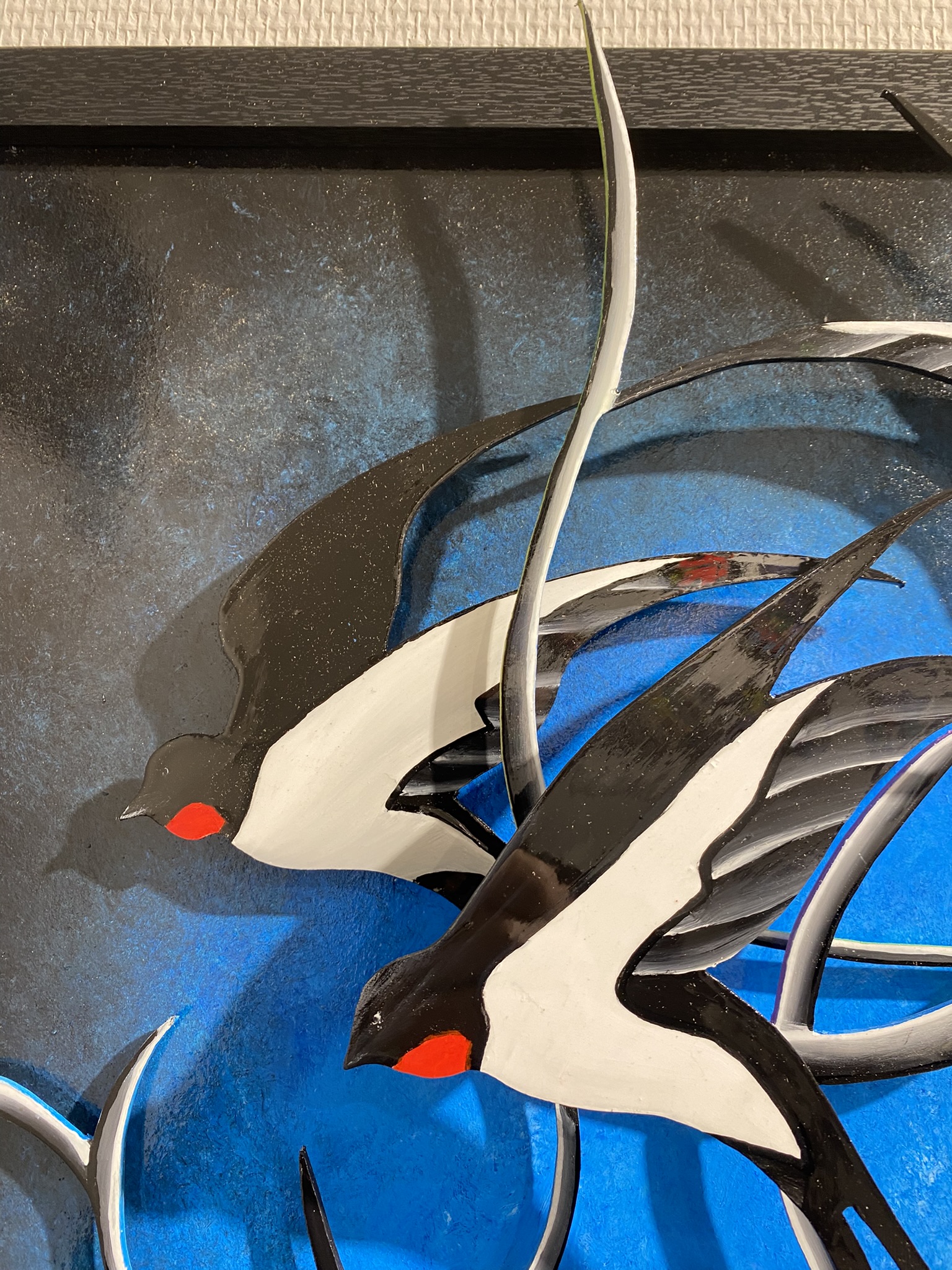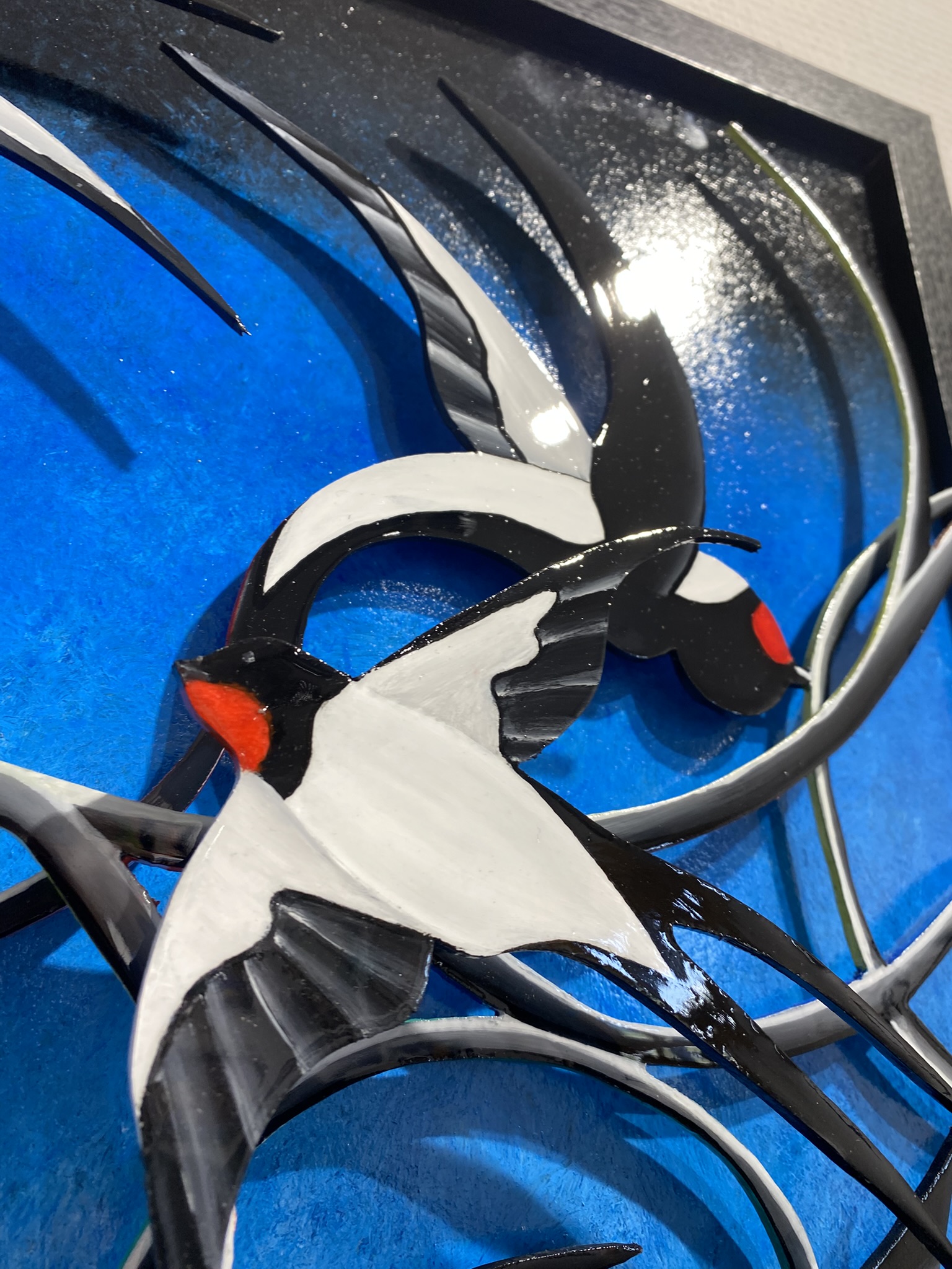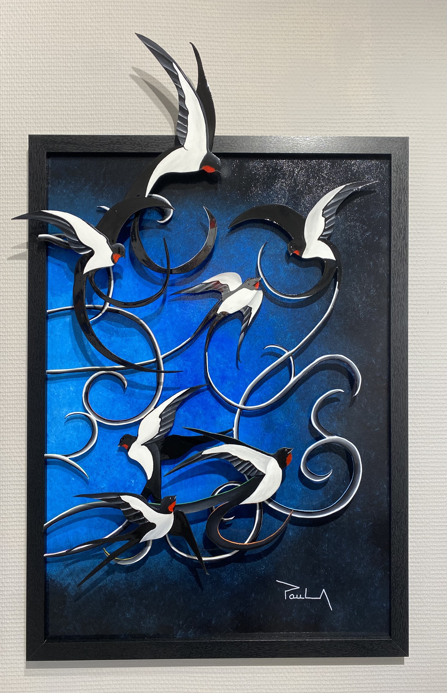 Sur un bleu profond, les oiseaux s’élancent et traversent les 3 panneaux en un seul souffle, guidés par des courbes sculptées qui évoquent des rubans de mouvements. Chaque ligne semble capturer l’élan d’une aile, l’inflexion d’un virage, l’instant suspendu d’un vol libre.