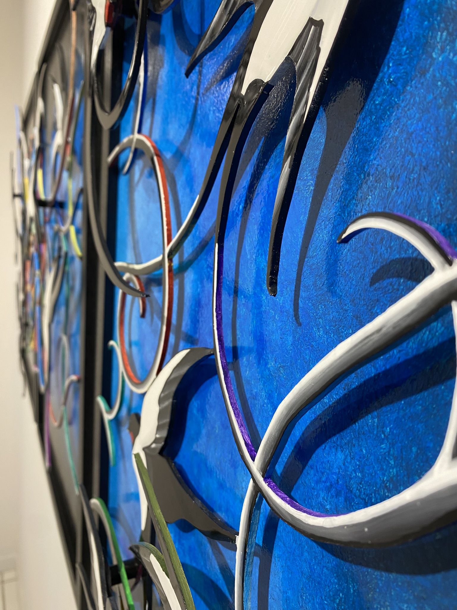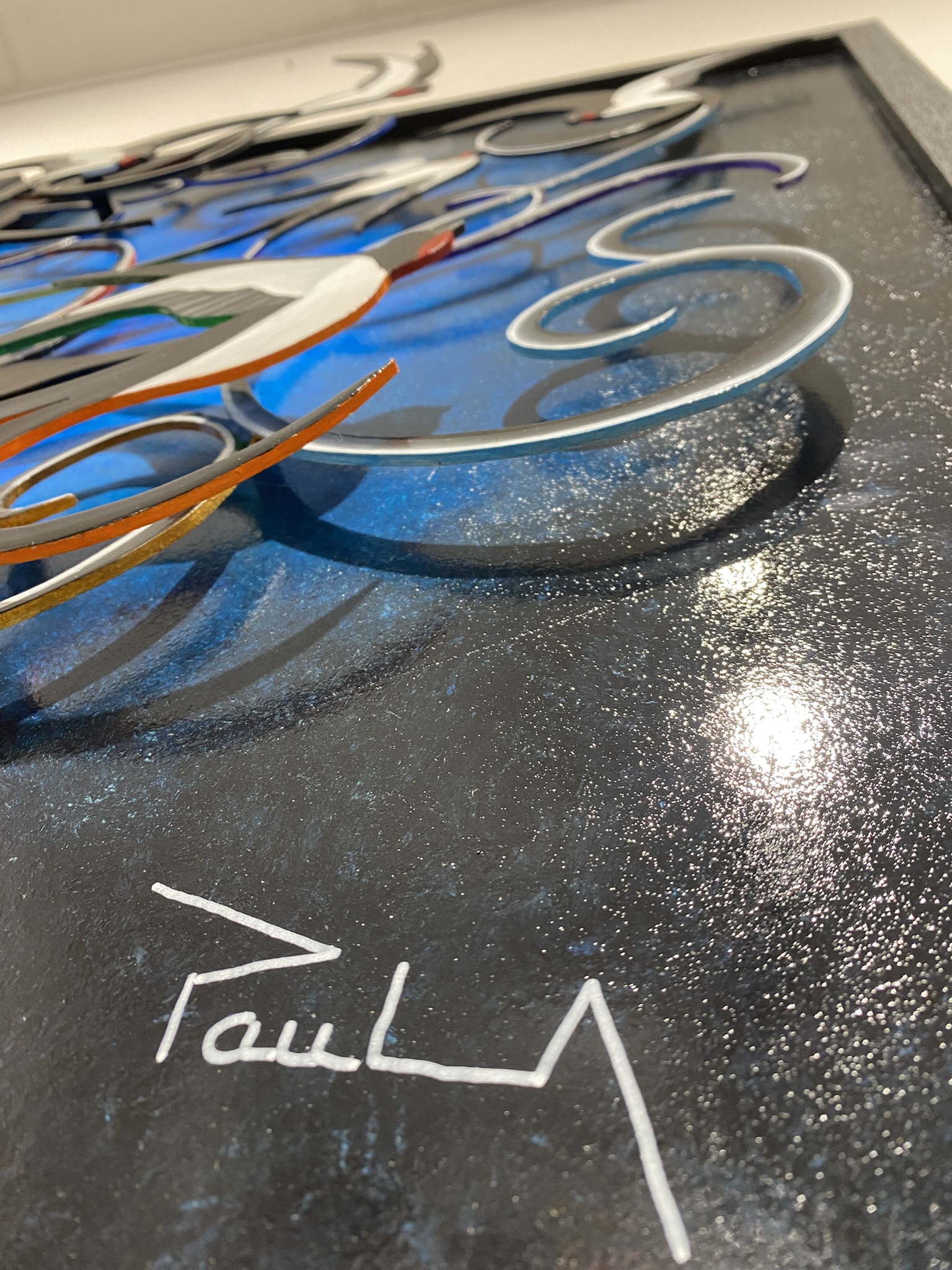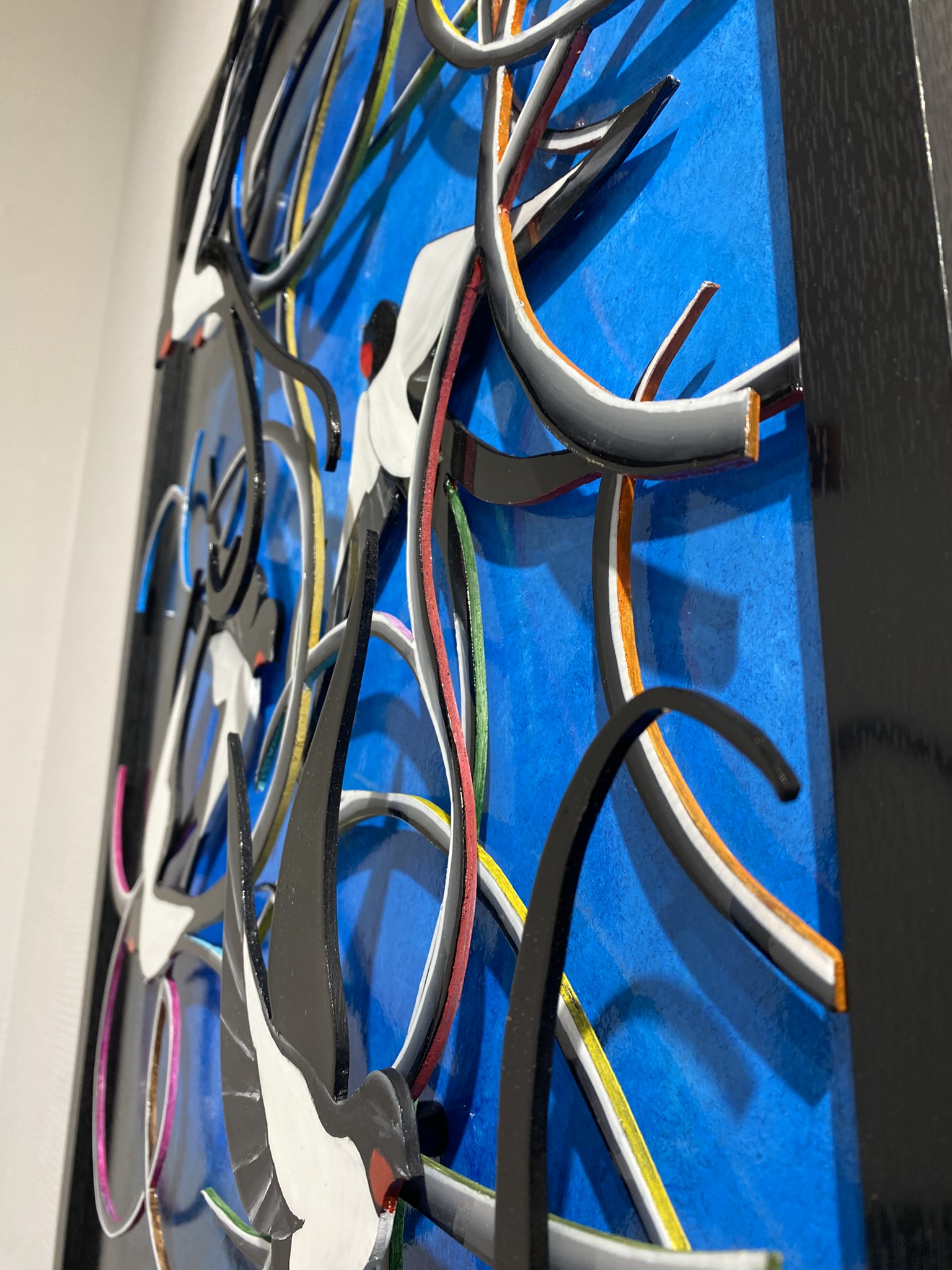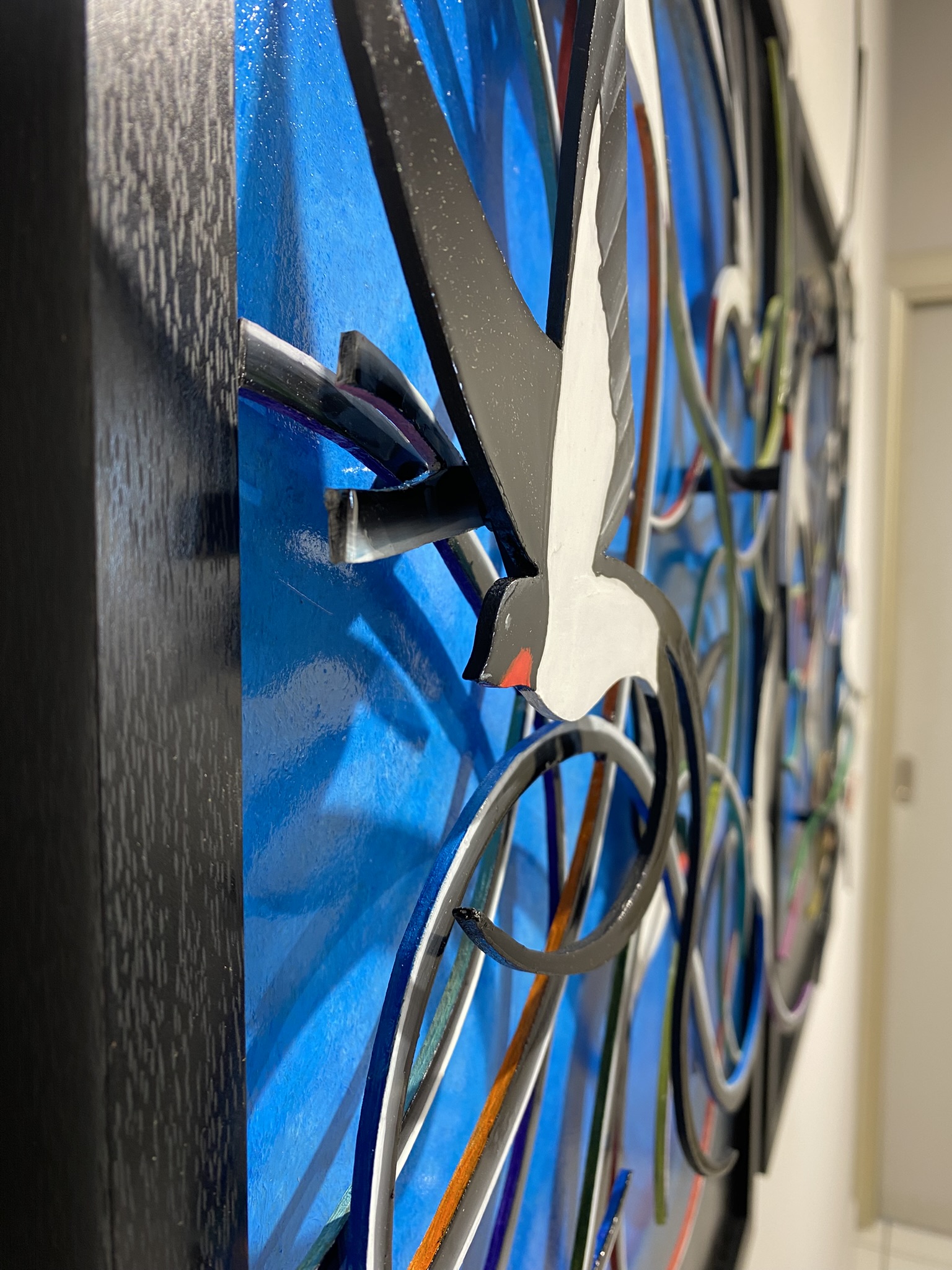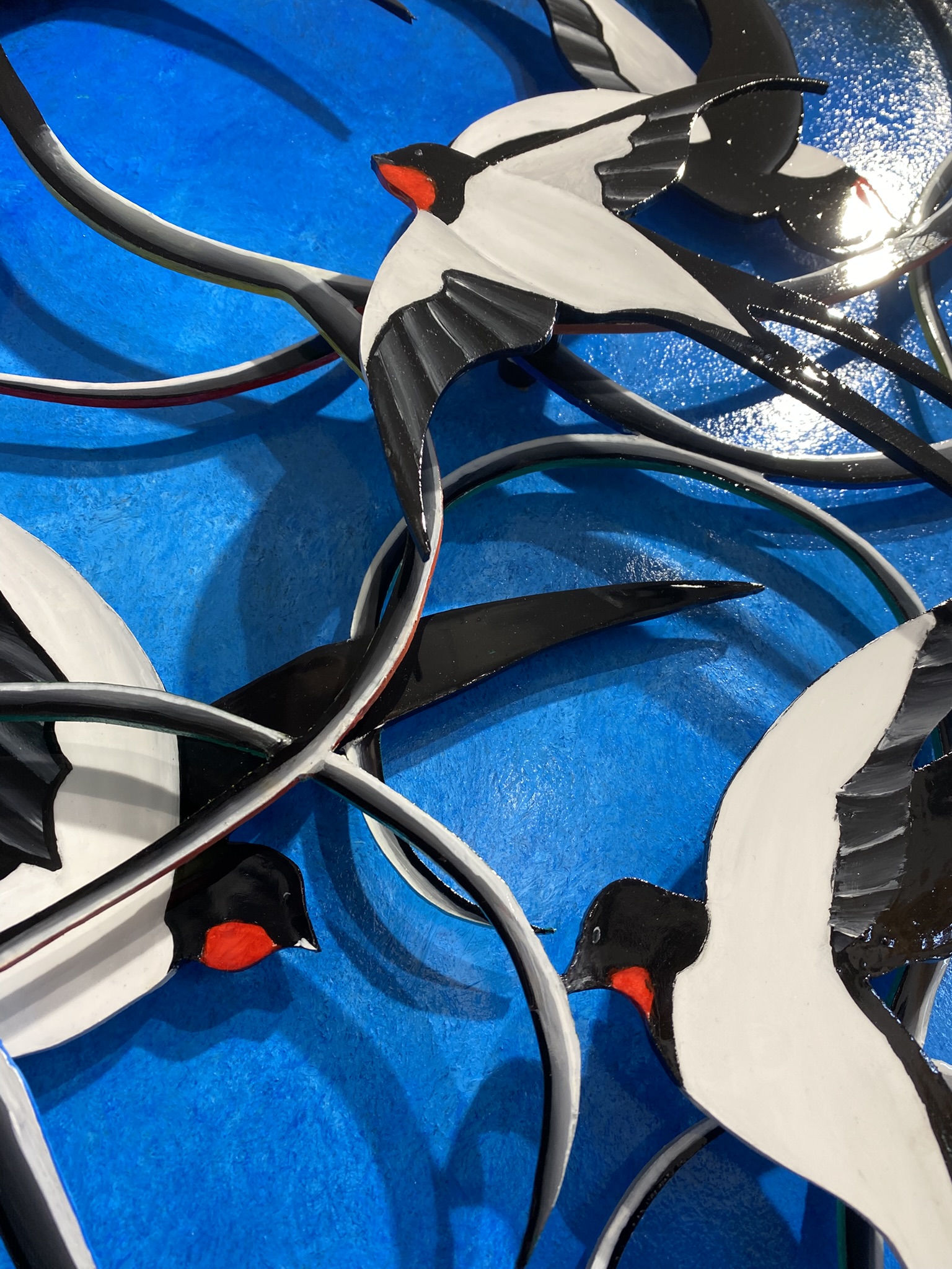 Sur un bleu profond, les oiseaux s’élancent et traversent les 3 panneaux en un seul souffle, guidés par des courbes sculptées qui évoquent des rubans de mouvements. Chaque ligne semble capturer l’élan d’une aile, l’inflexion d’un virage, l’instant suspendu d’un vol libre.