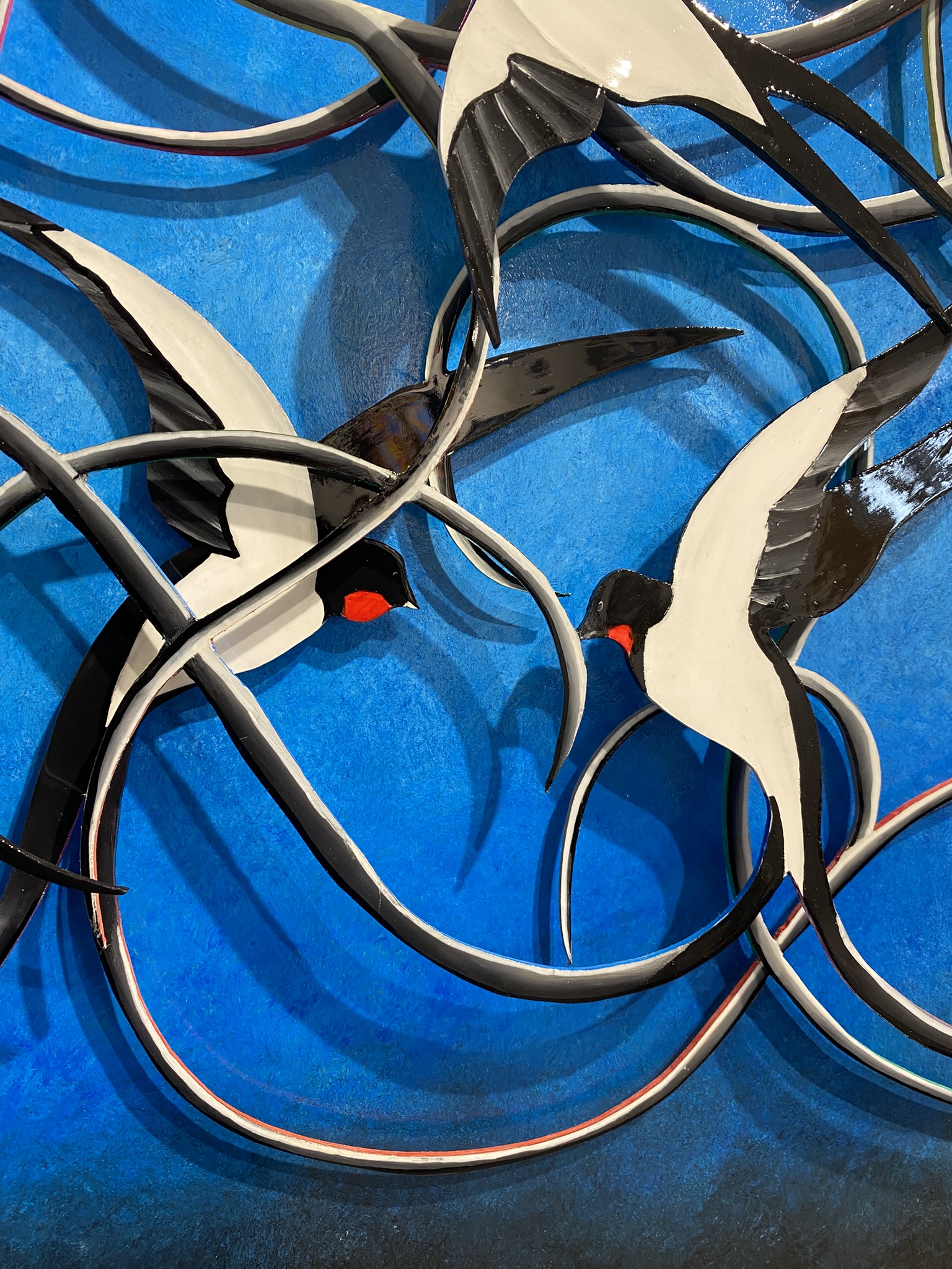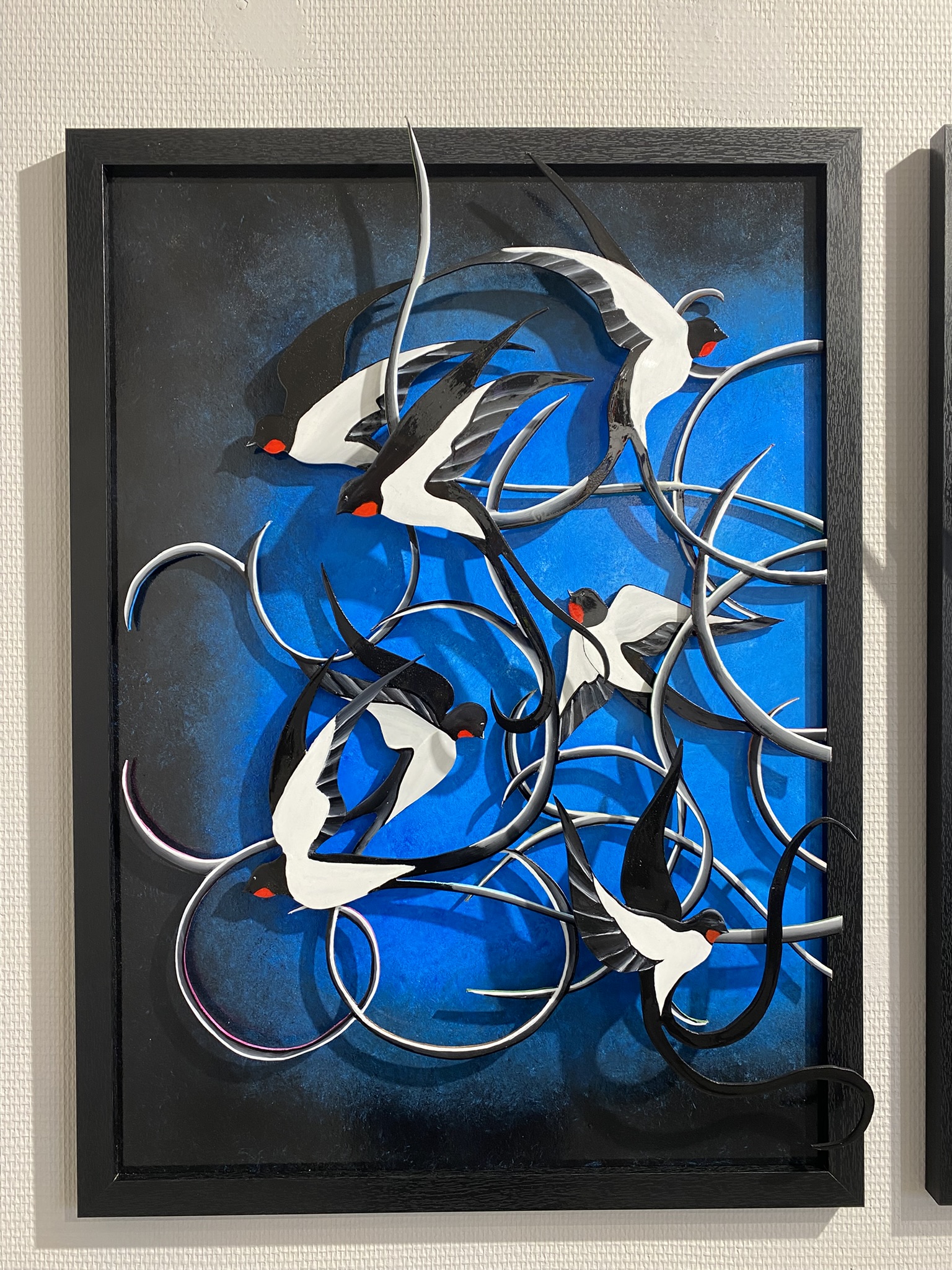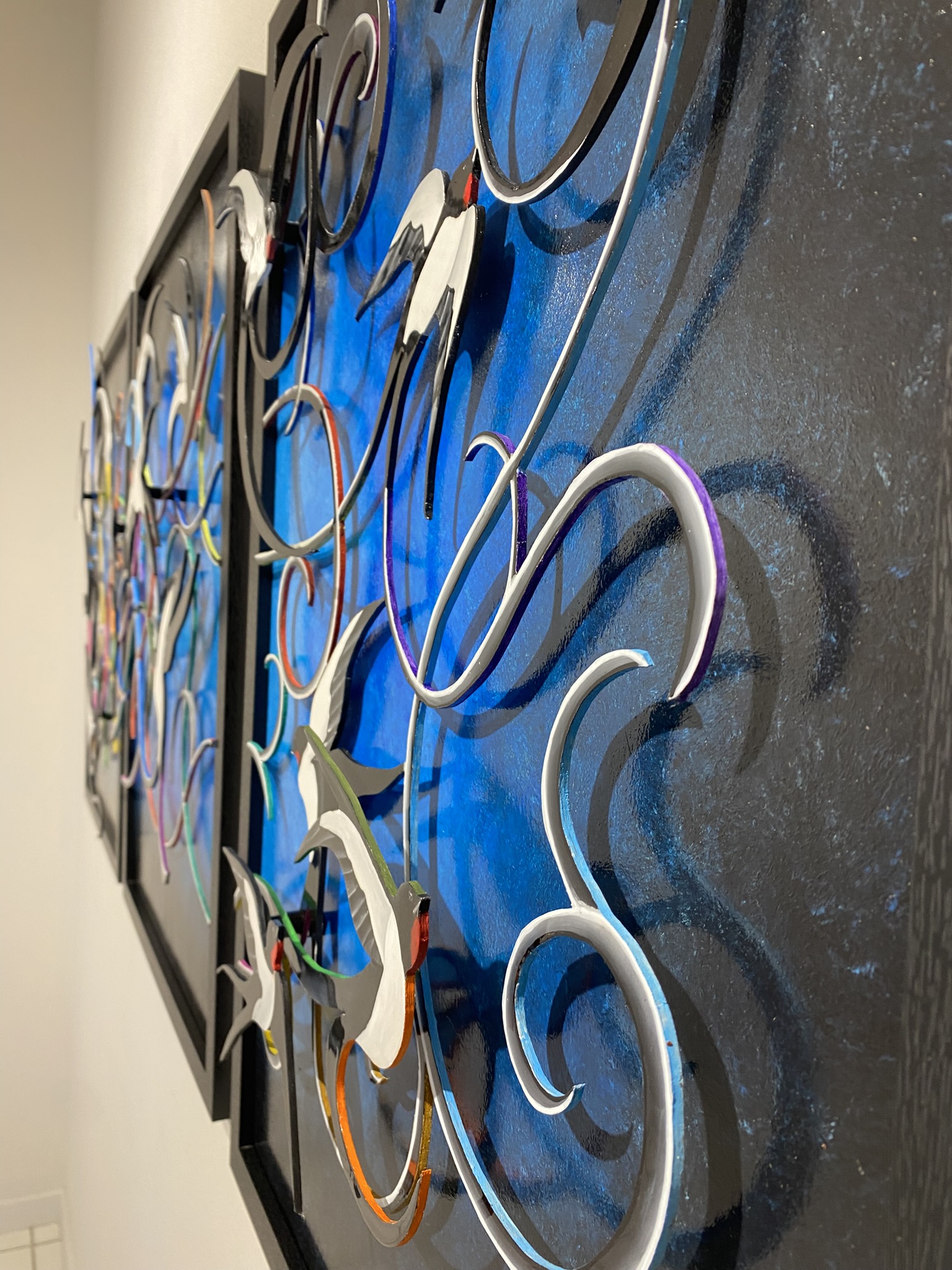 Against a deep blue, the birds soar and cross the three panels in a single breath, guided by sculpted curves that evoke ribbons of movement. Each line seems to capture the thrust of a wing, the inflection of a turn, the suspended moment of free flight.