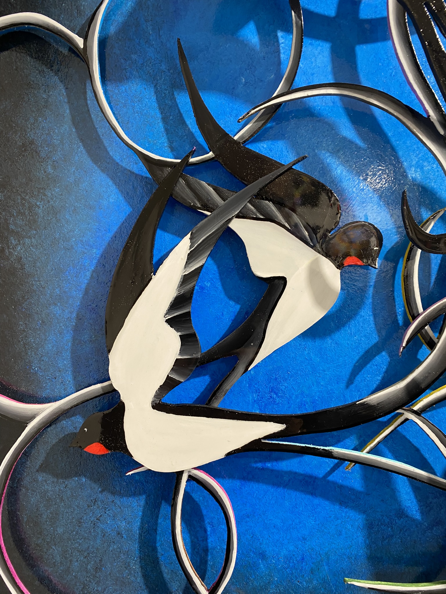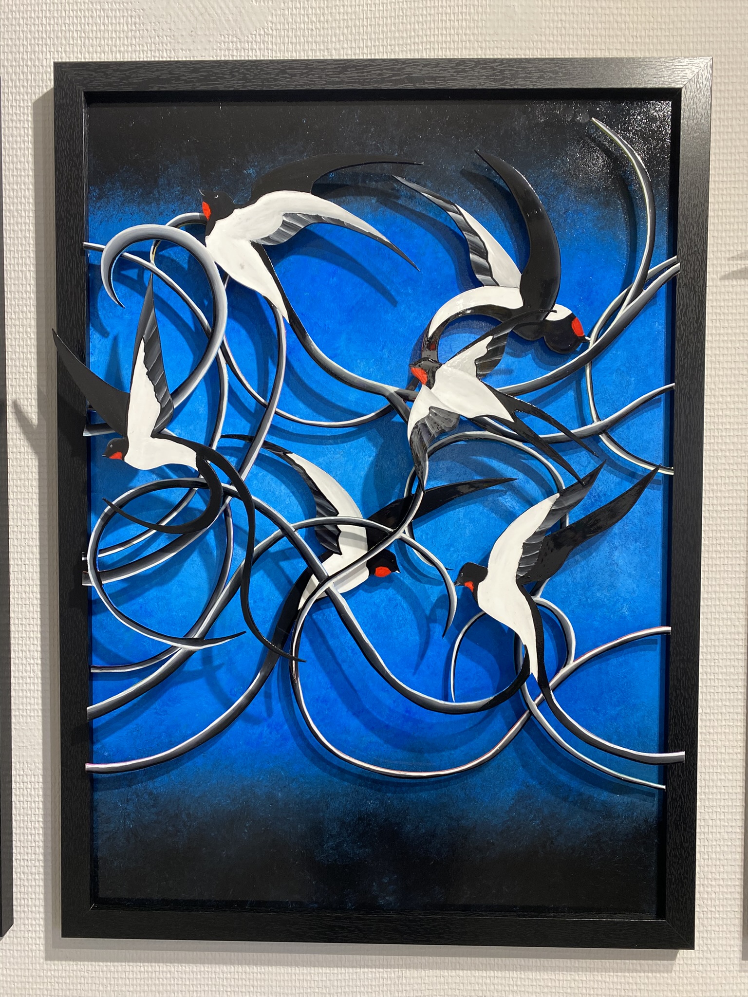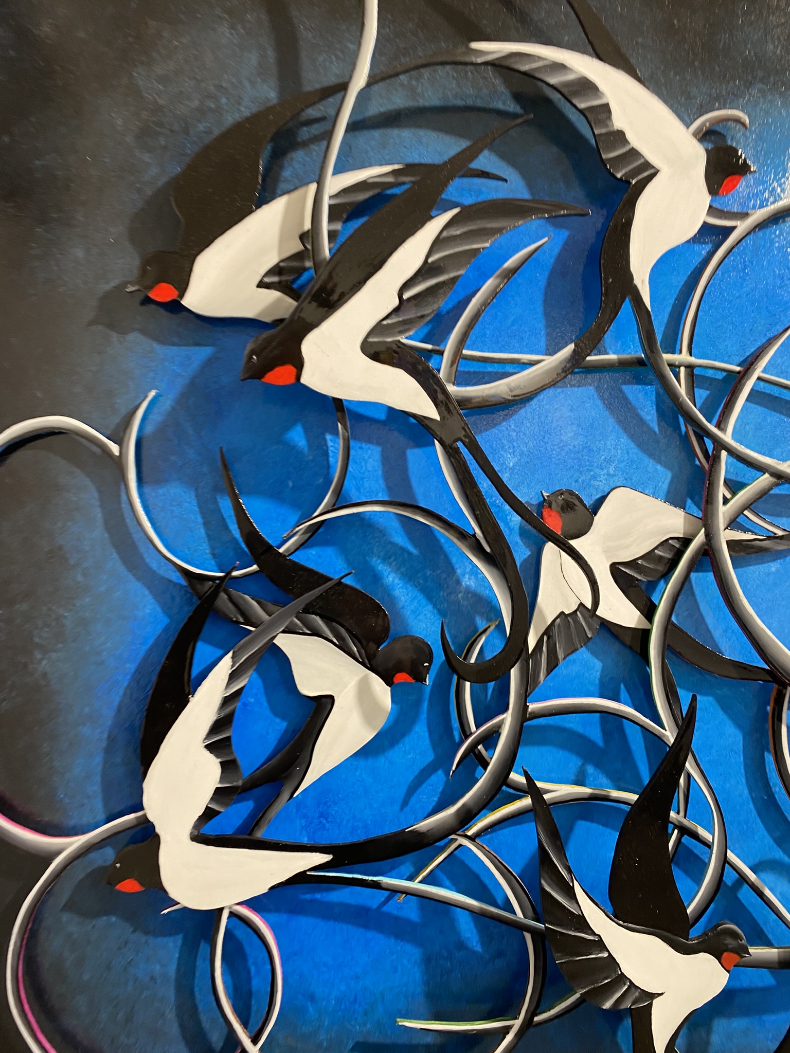Against a deep blue, the birds soar and cross the three panels in a single breath, guided by sculpted curves that evoke ribbons of movement. Each line seems to capture the thrust of a wing, the inflection of a turn, the suspended moment of free flight.