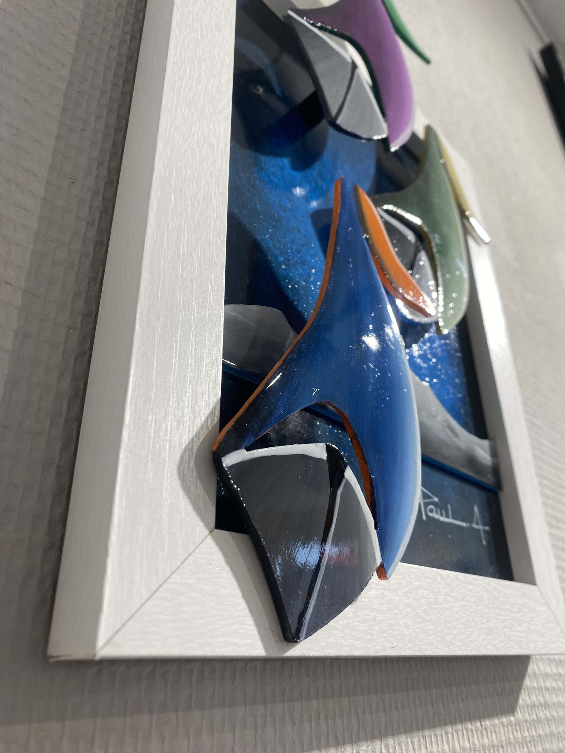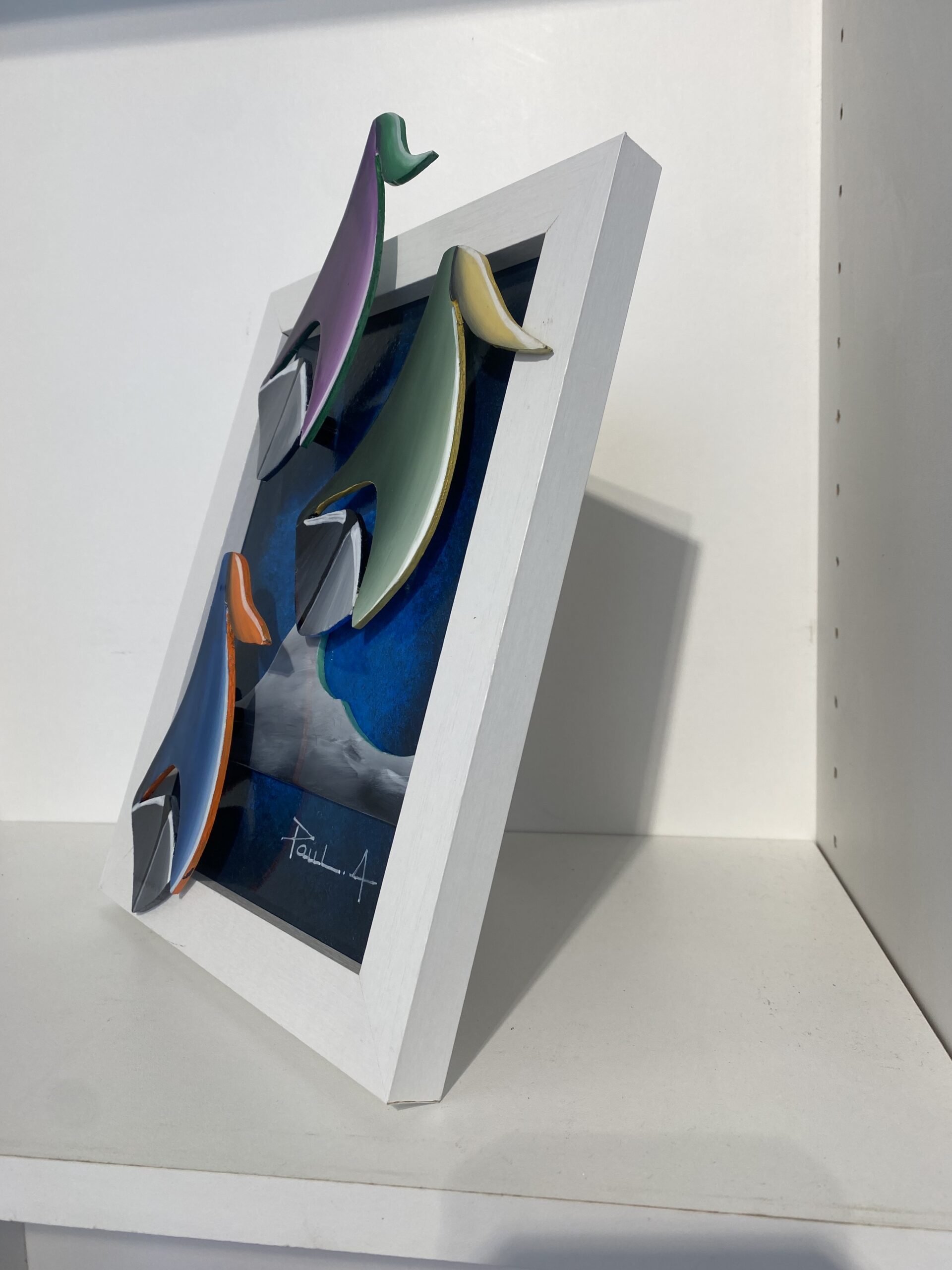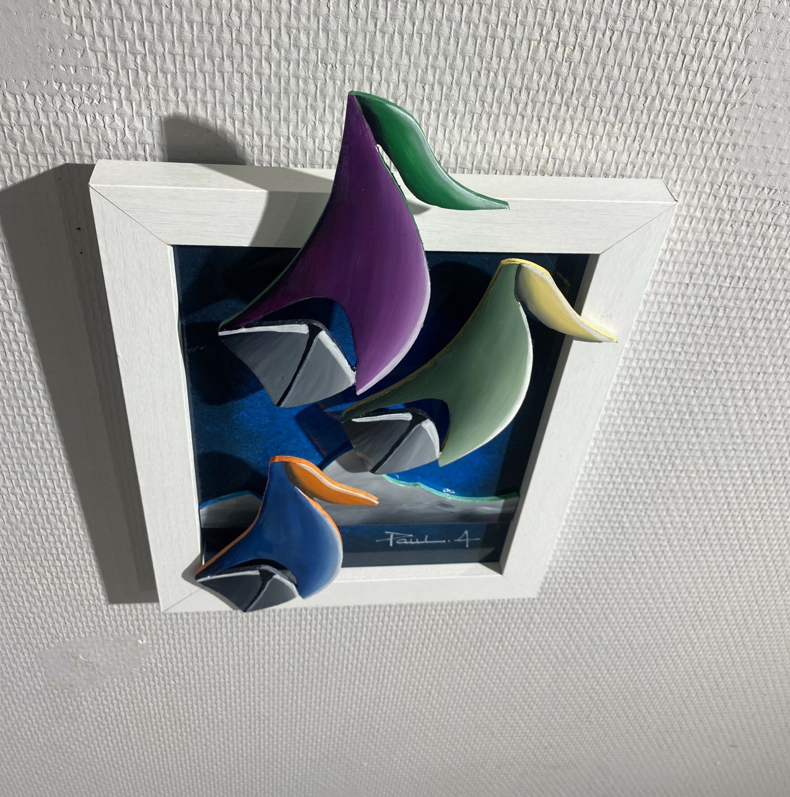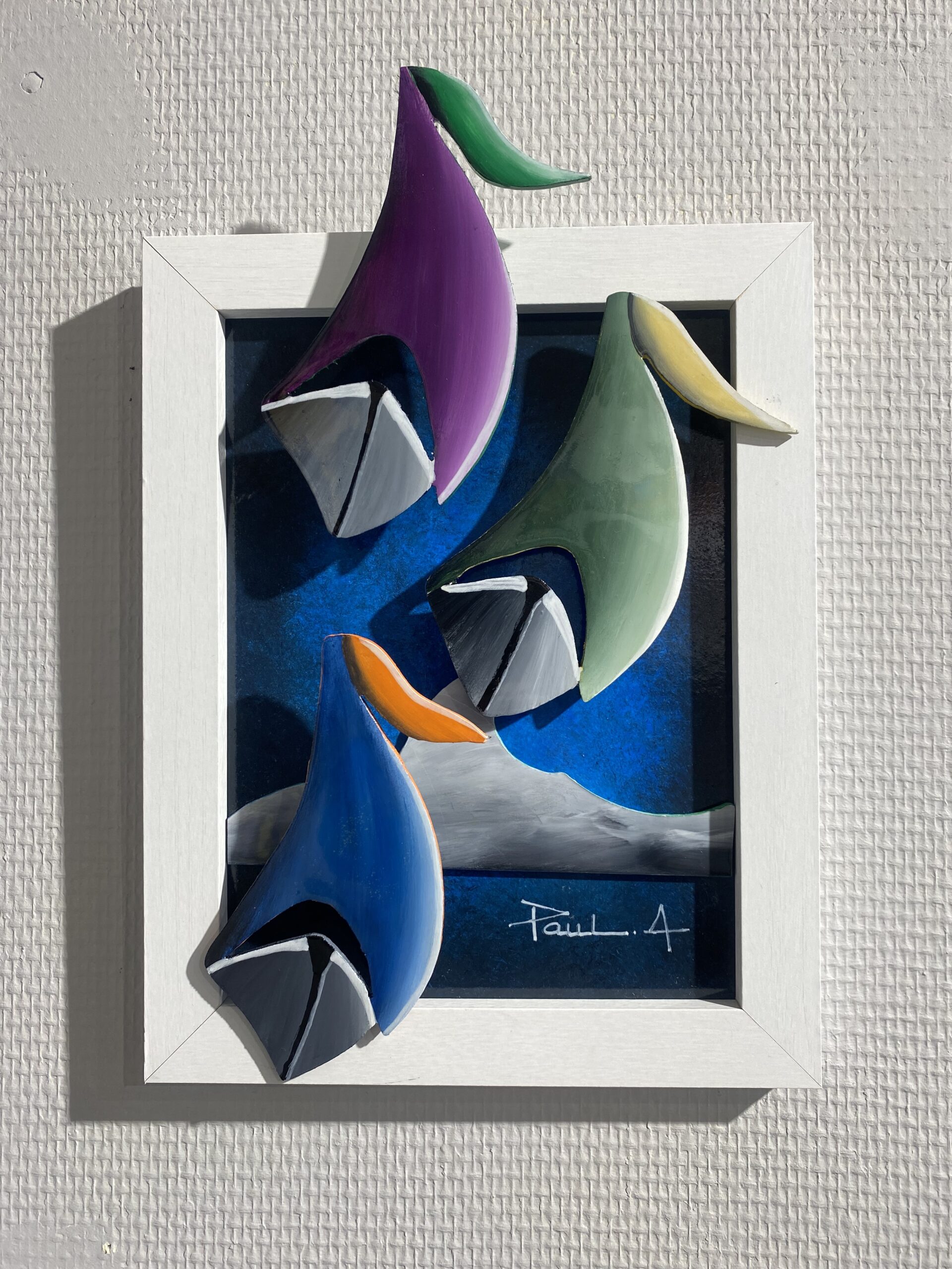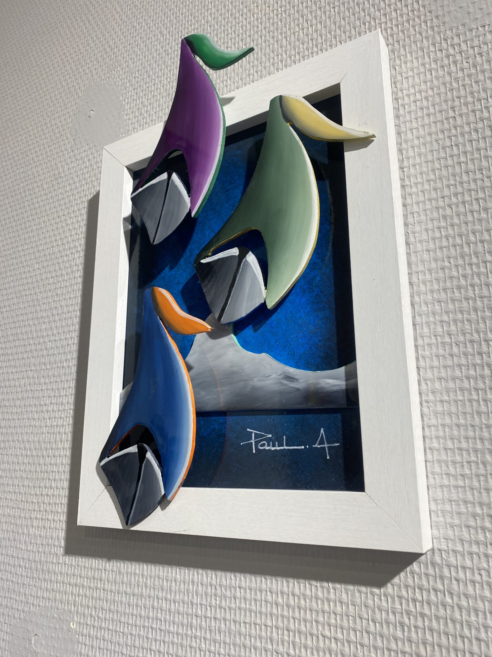 Sur un fond bleu azur, 3 bateaux s’échappent du cadre, comme portés par le vent.