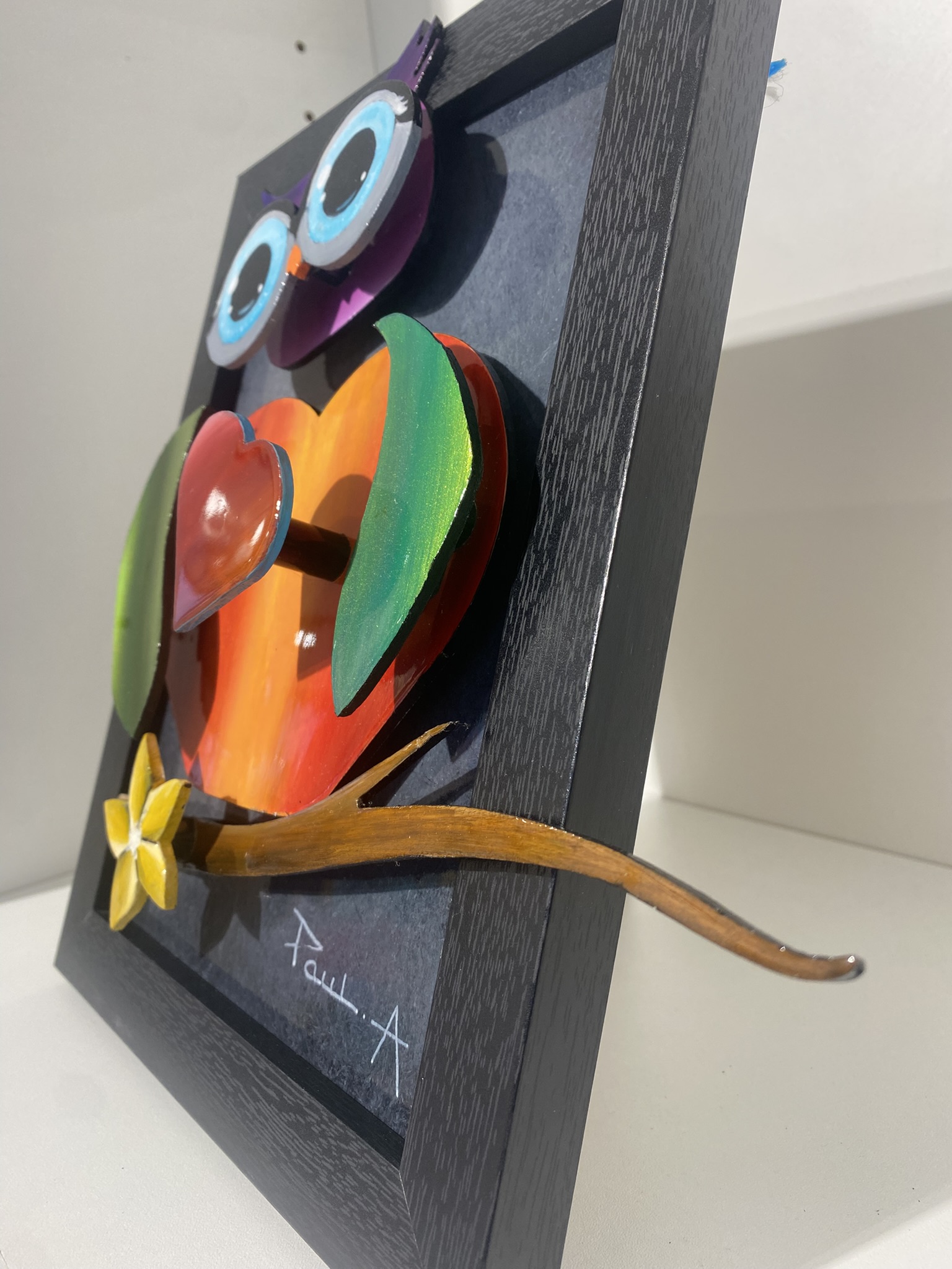 Perched Heart represents a stylized owl, a vigilant guardian of a vibrant heart nestled in its chest.