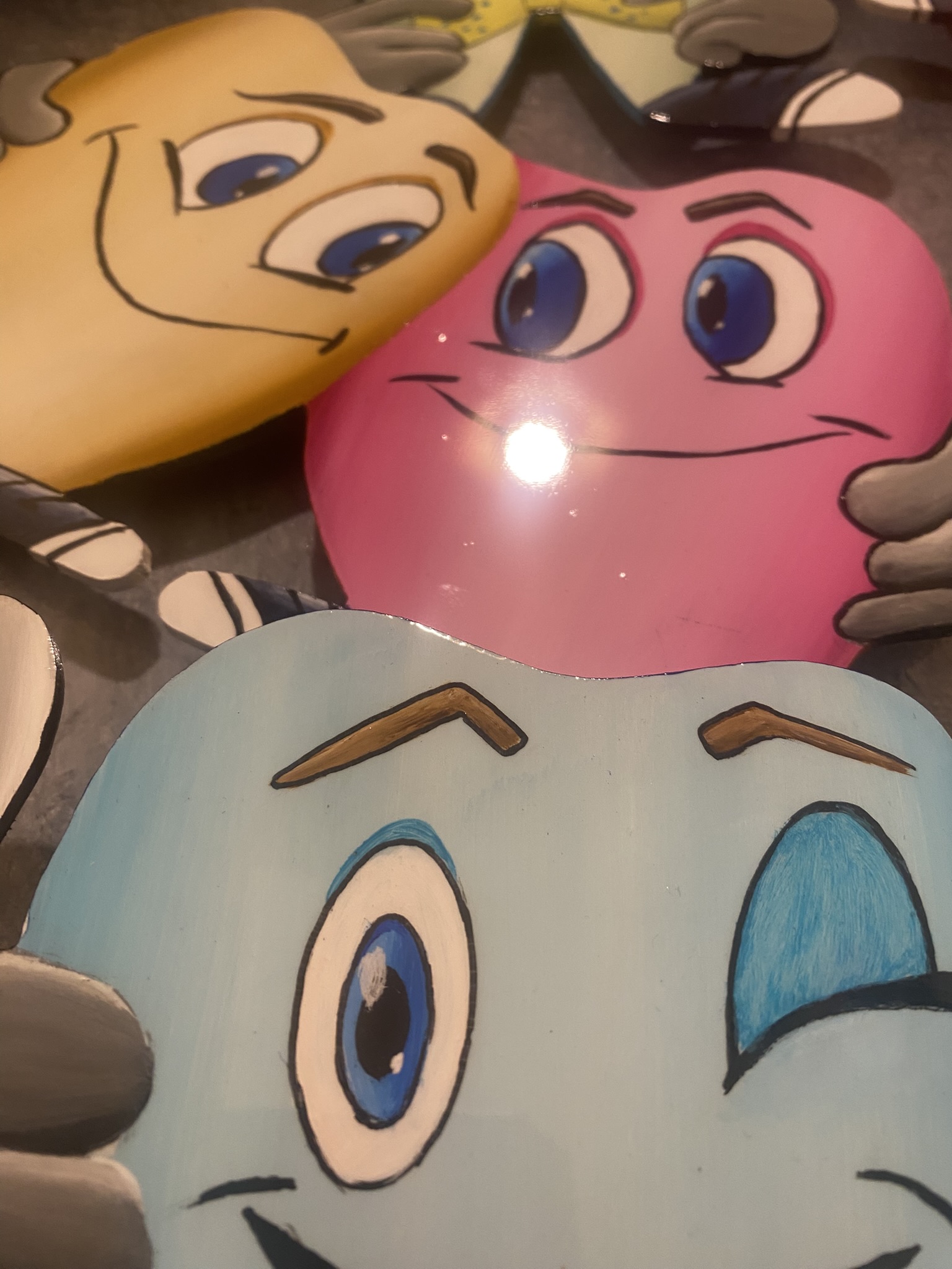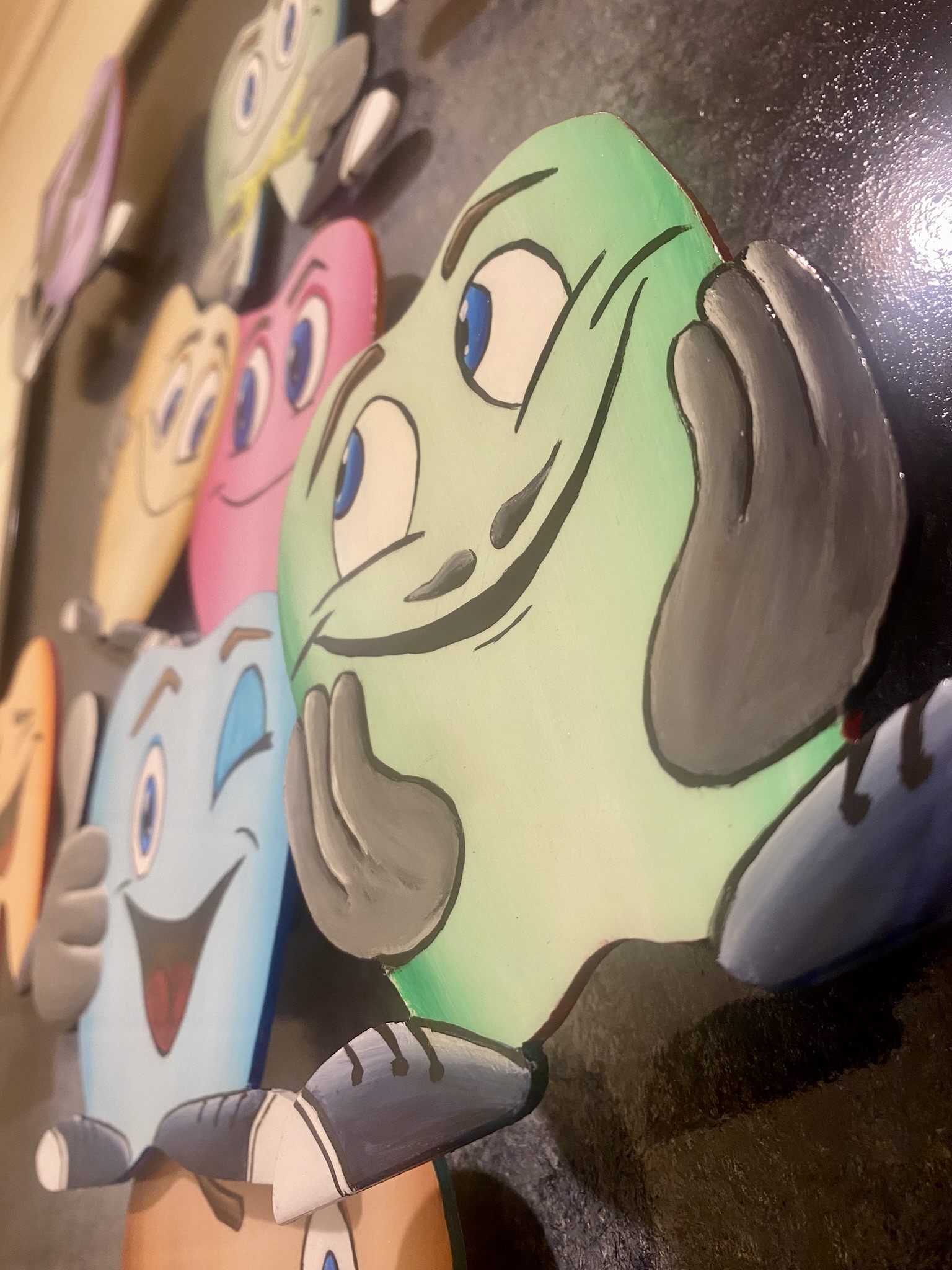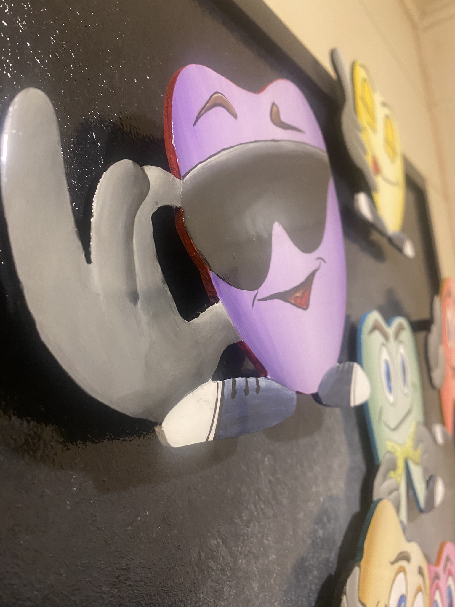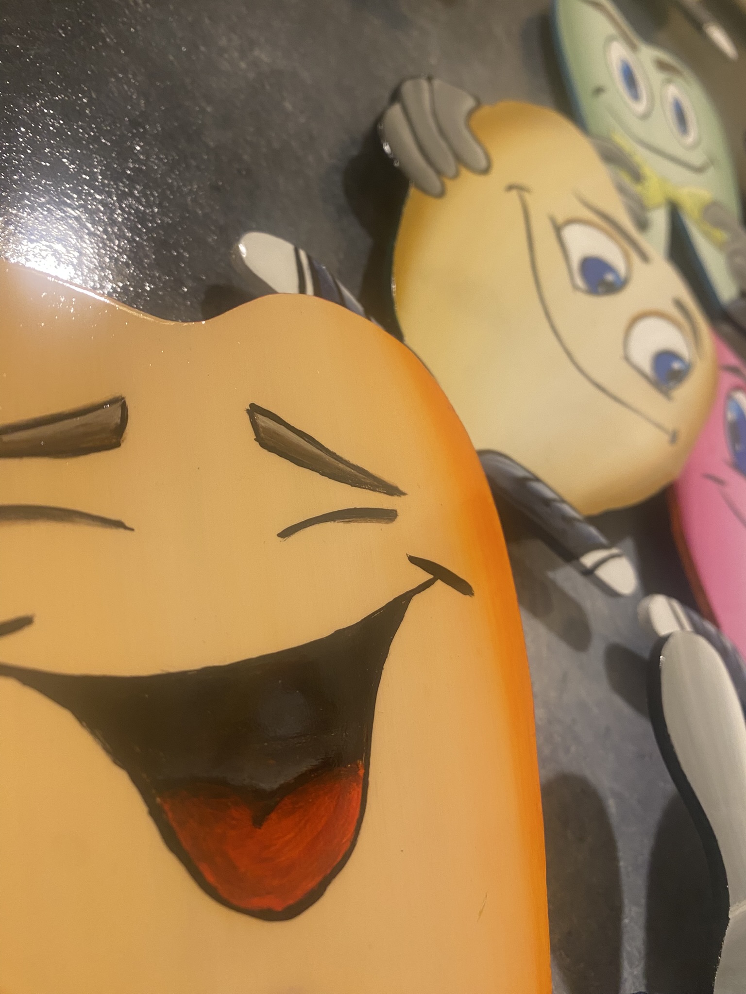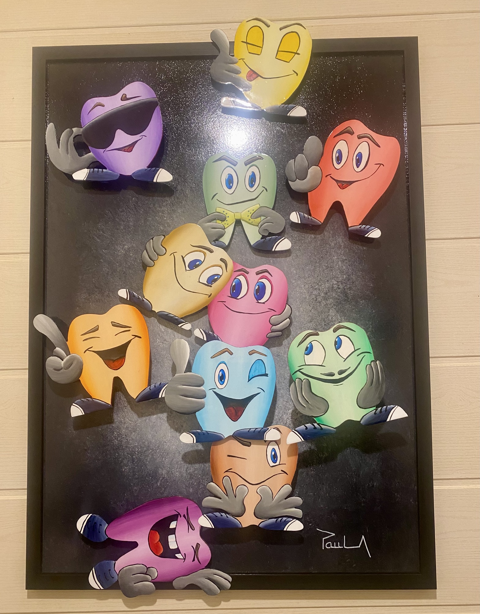Dans cette oeuvre pleine d’esprit, voici réunit une joyeuse troupe de dents colorées, chacune dotée de sa propre personnalité. Sourires malicieux, clins d’oeil complices, attitude décalées… Chaque dent devient un personnage à part entière, presque prêt à trinquer !!