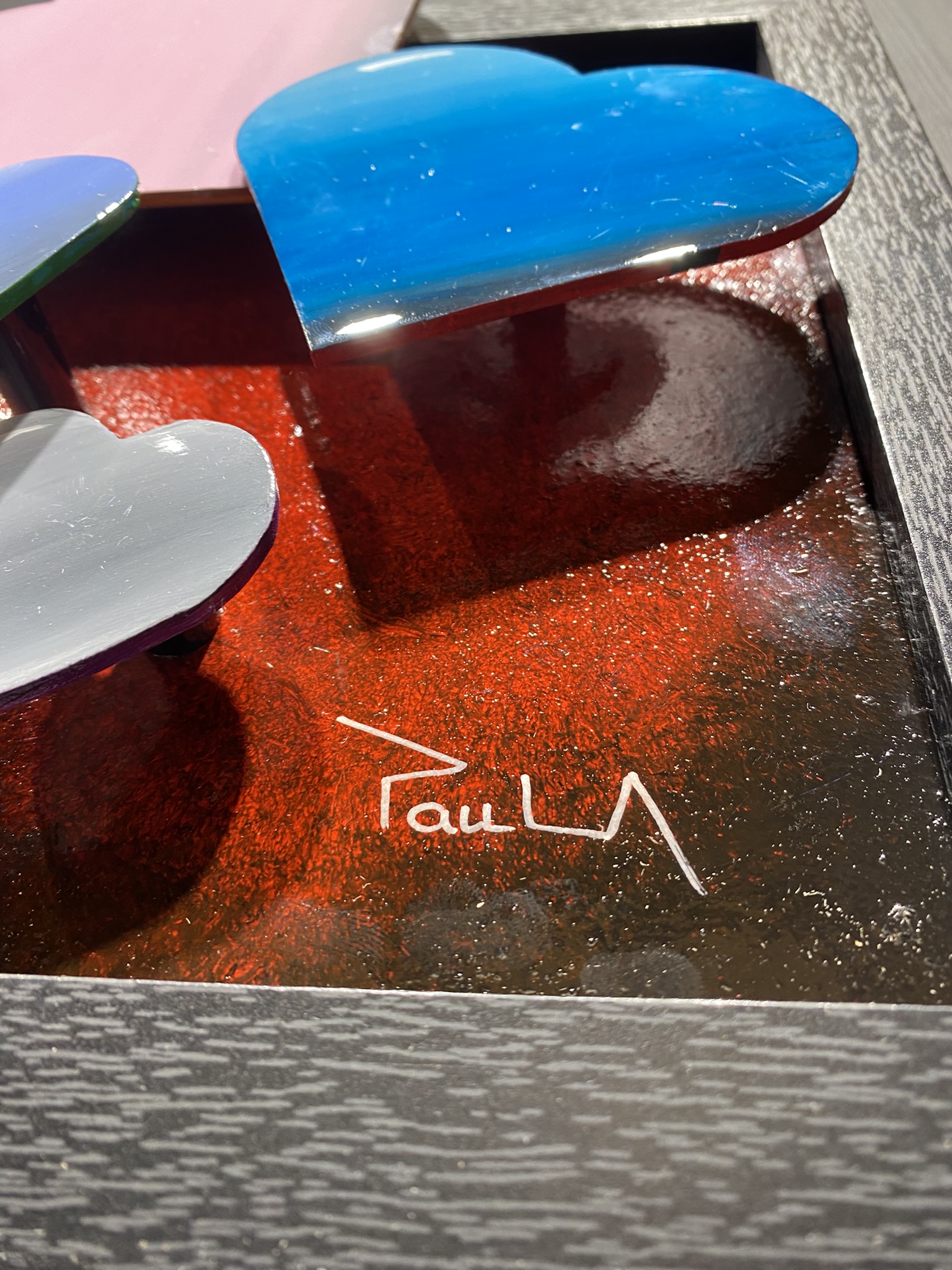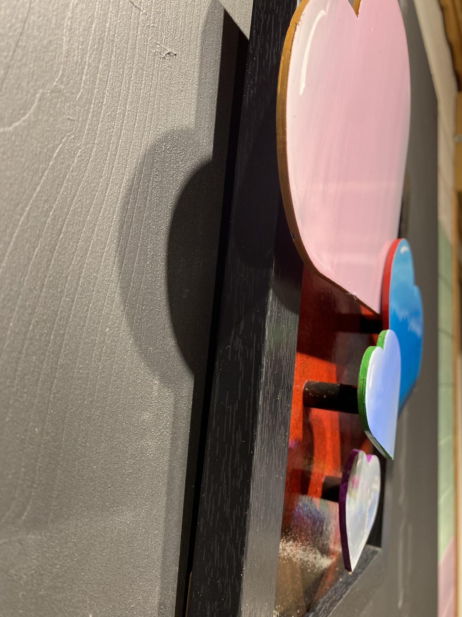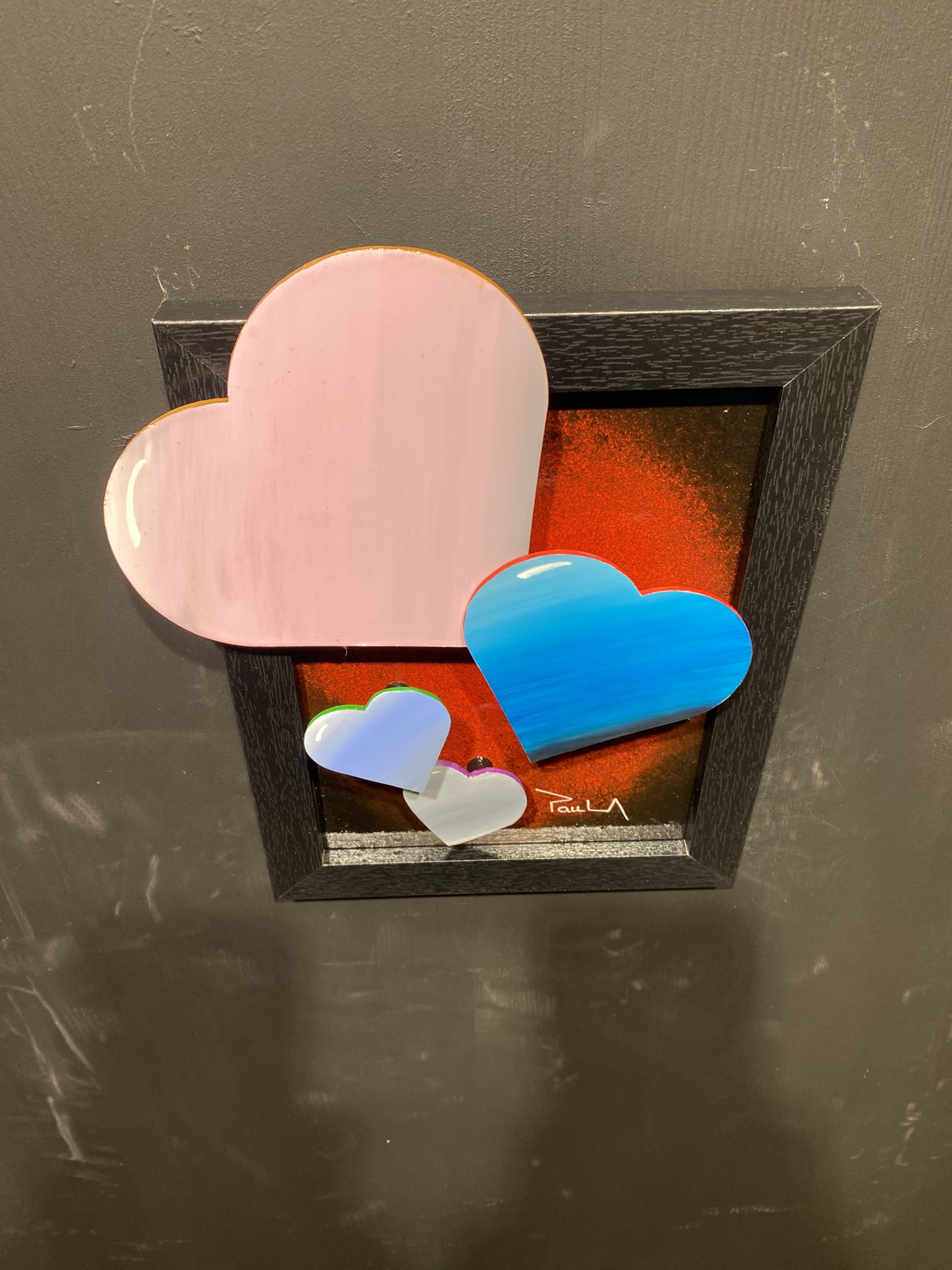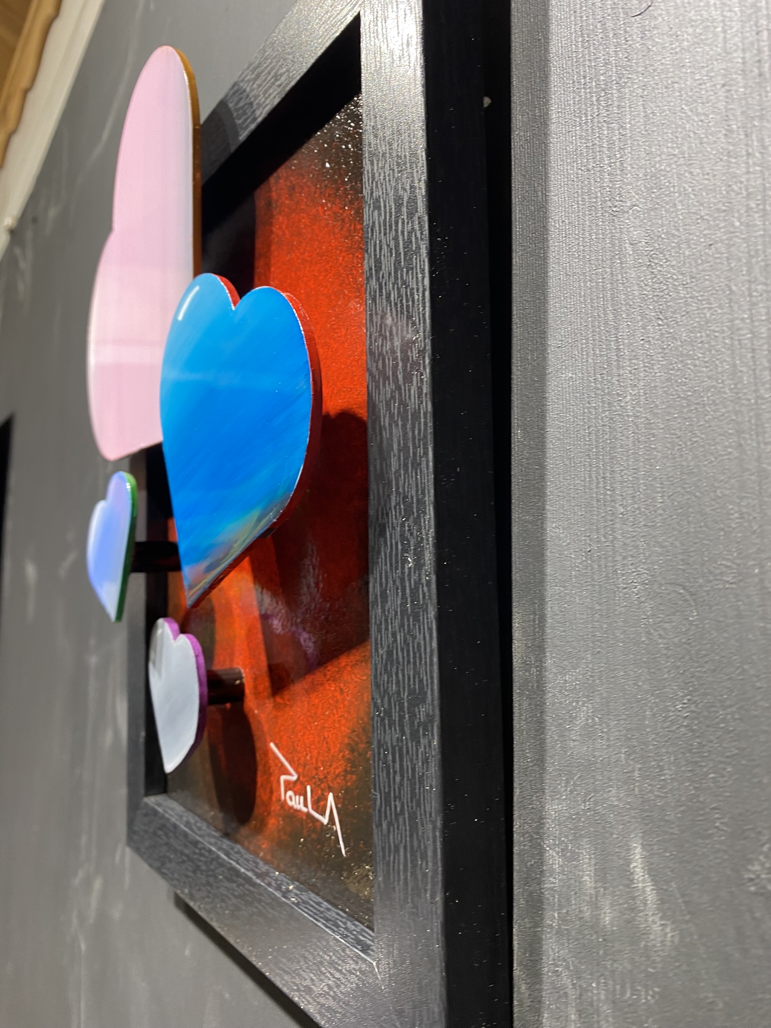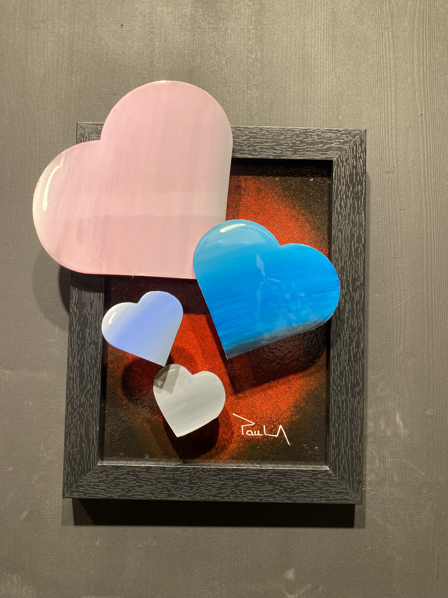Au centre, la lumière rouge chaude vient révéler les formes et créer une atmosphère intime, presque vibrante. Les cœurs se rapprochent, se croisent, se superposent… comme des émotions qui se rencontrent.