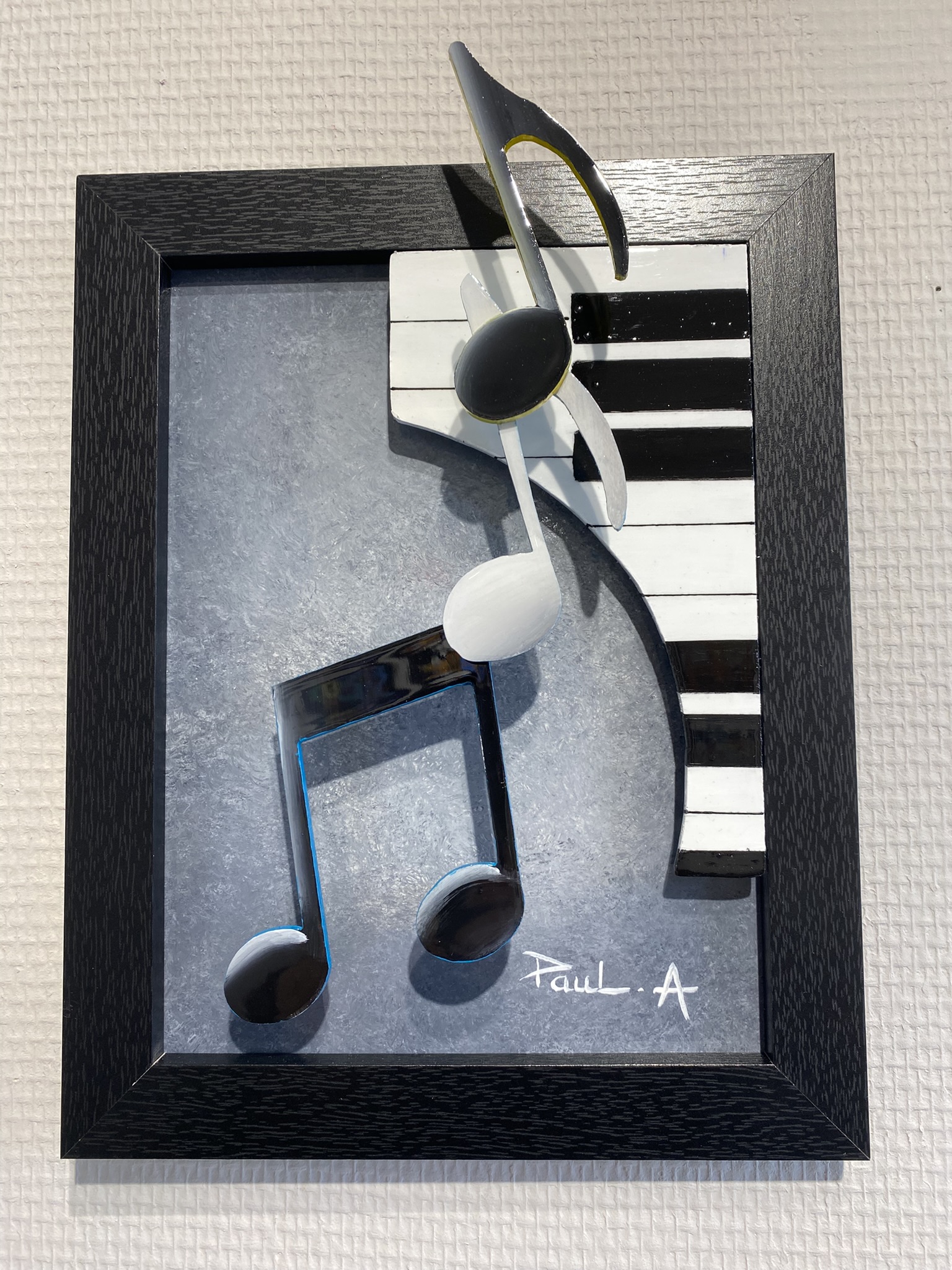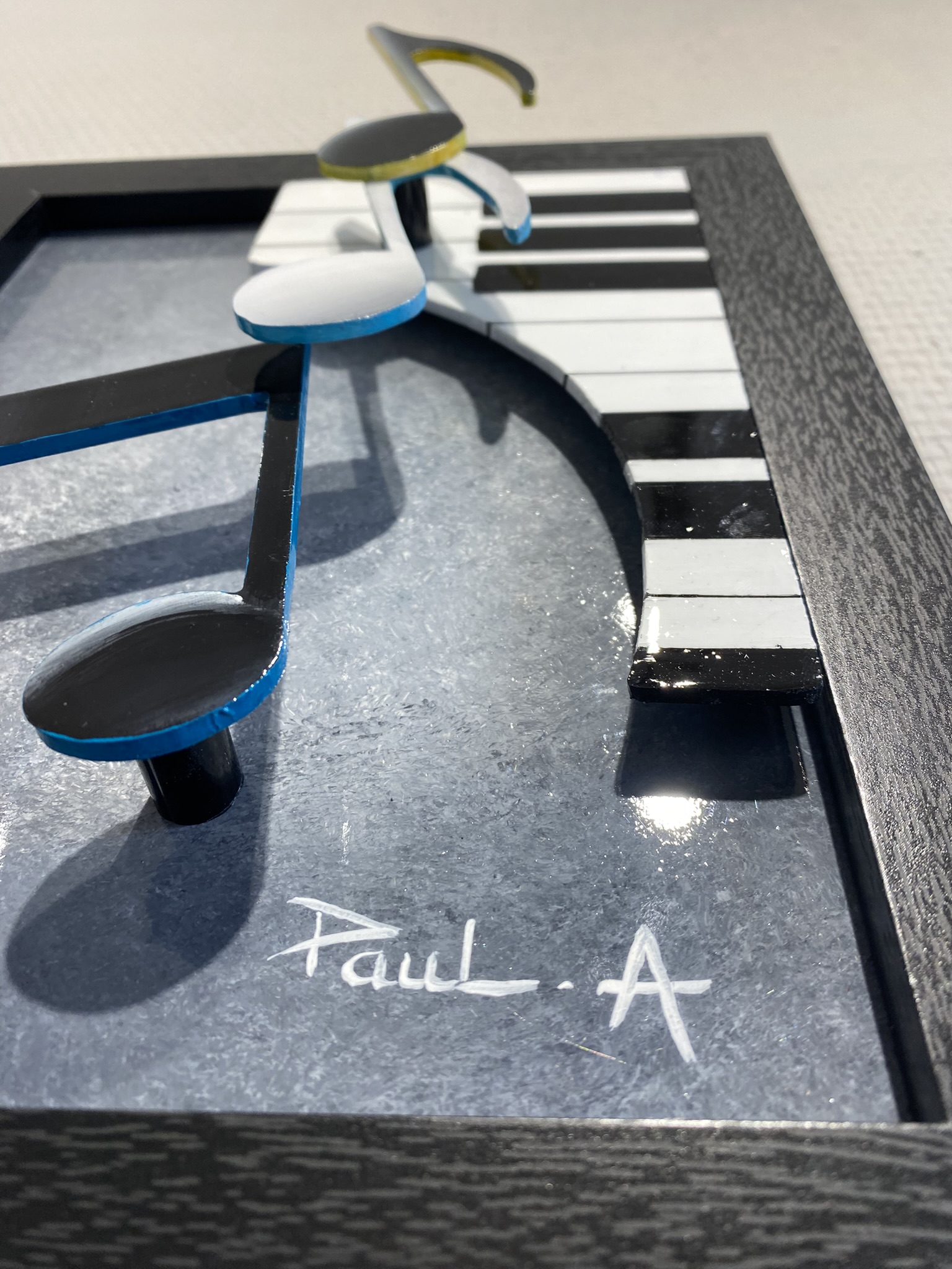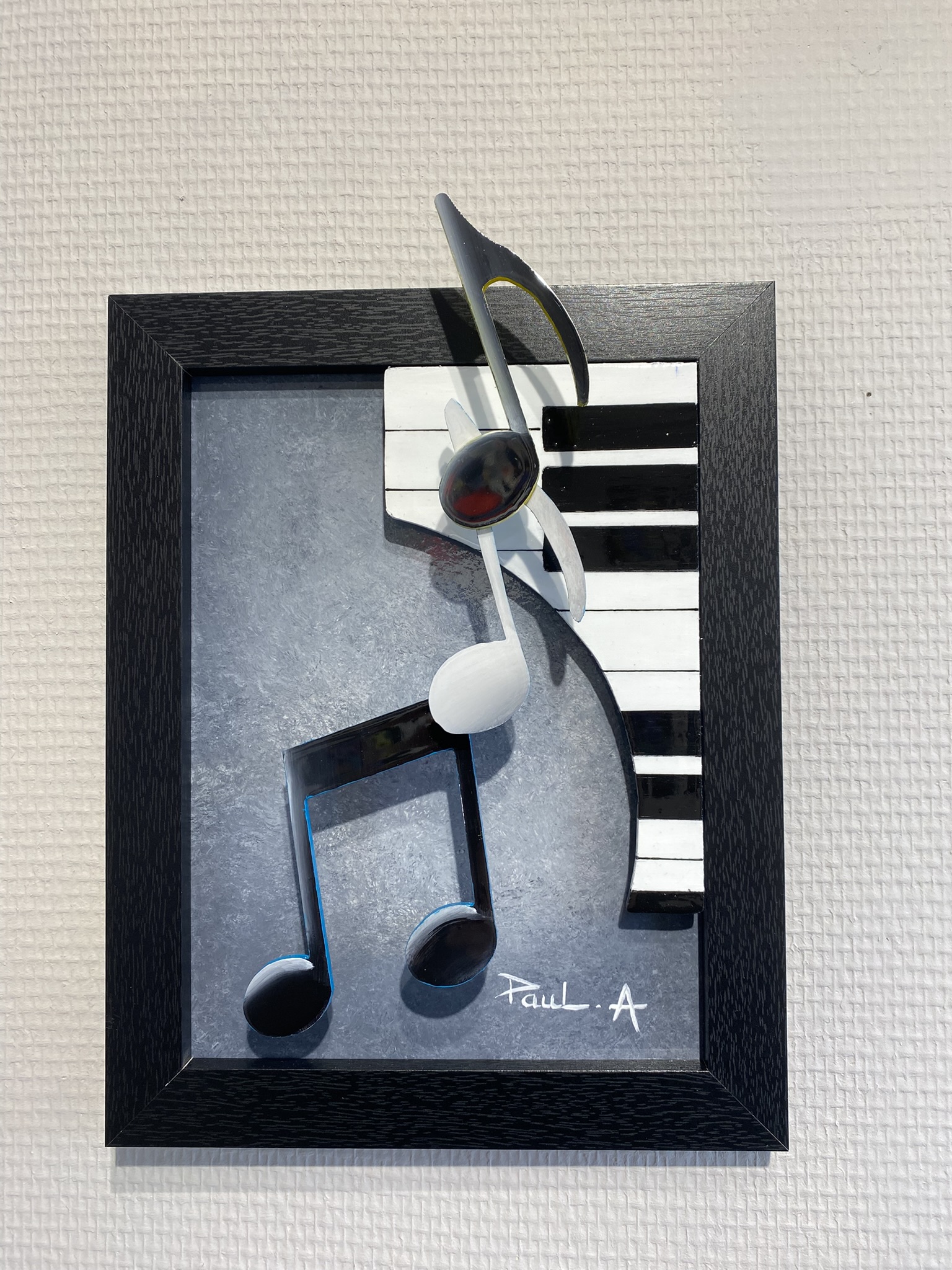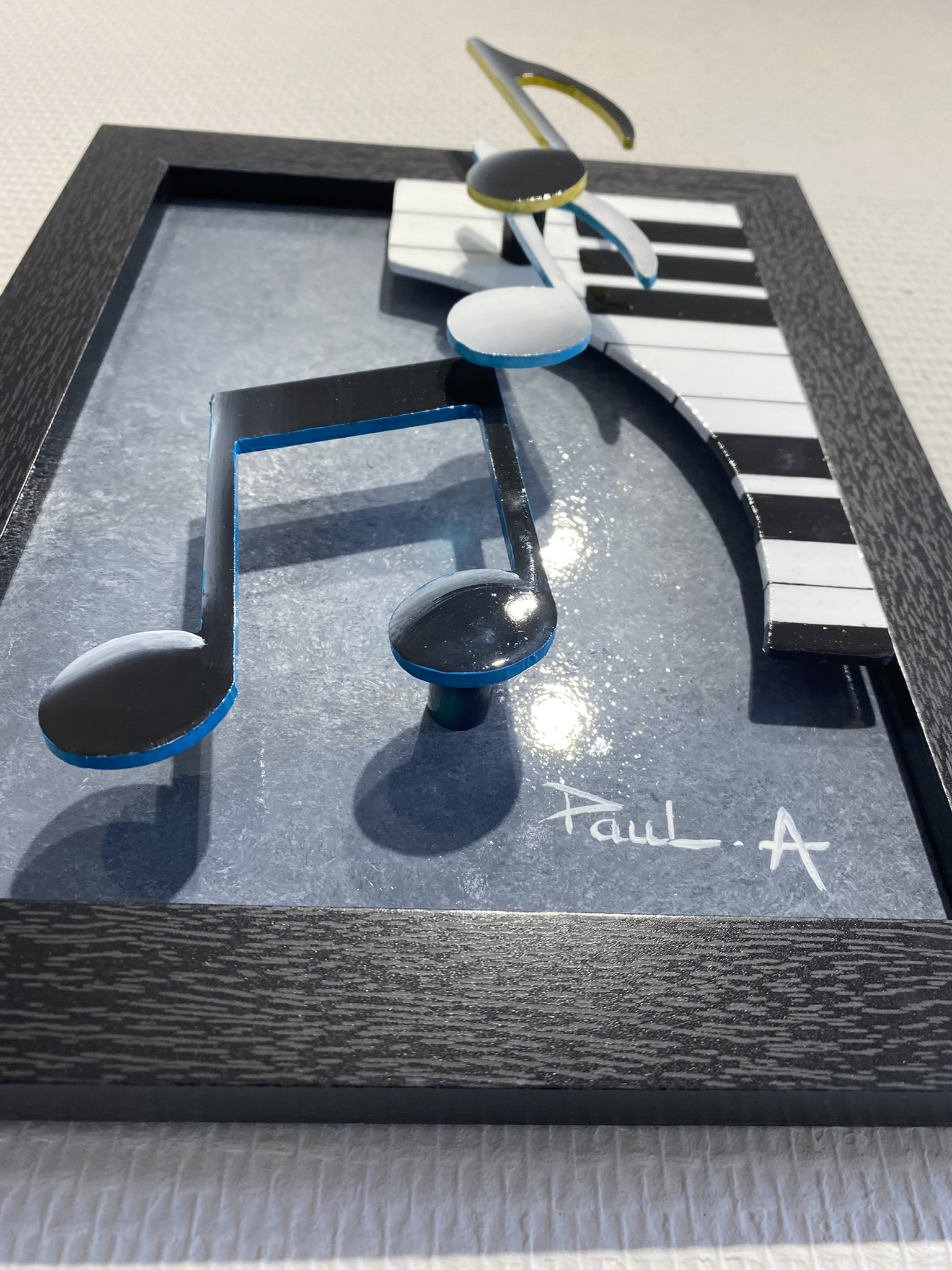 Dans ce petit format, on retrouve une composition dynamique où un clavier stylisé rencontre des notes sculptées en relief.