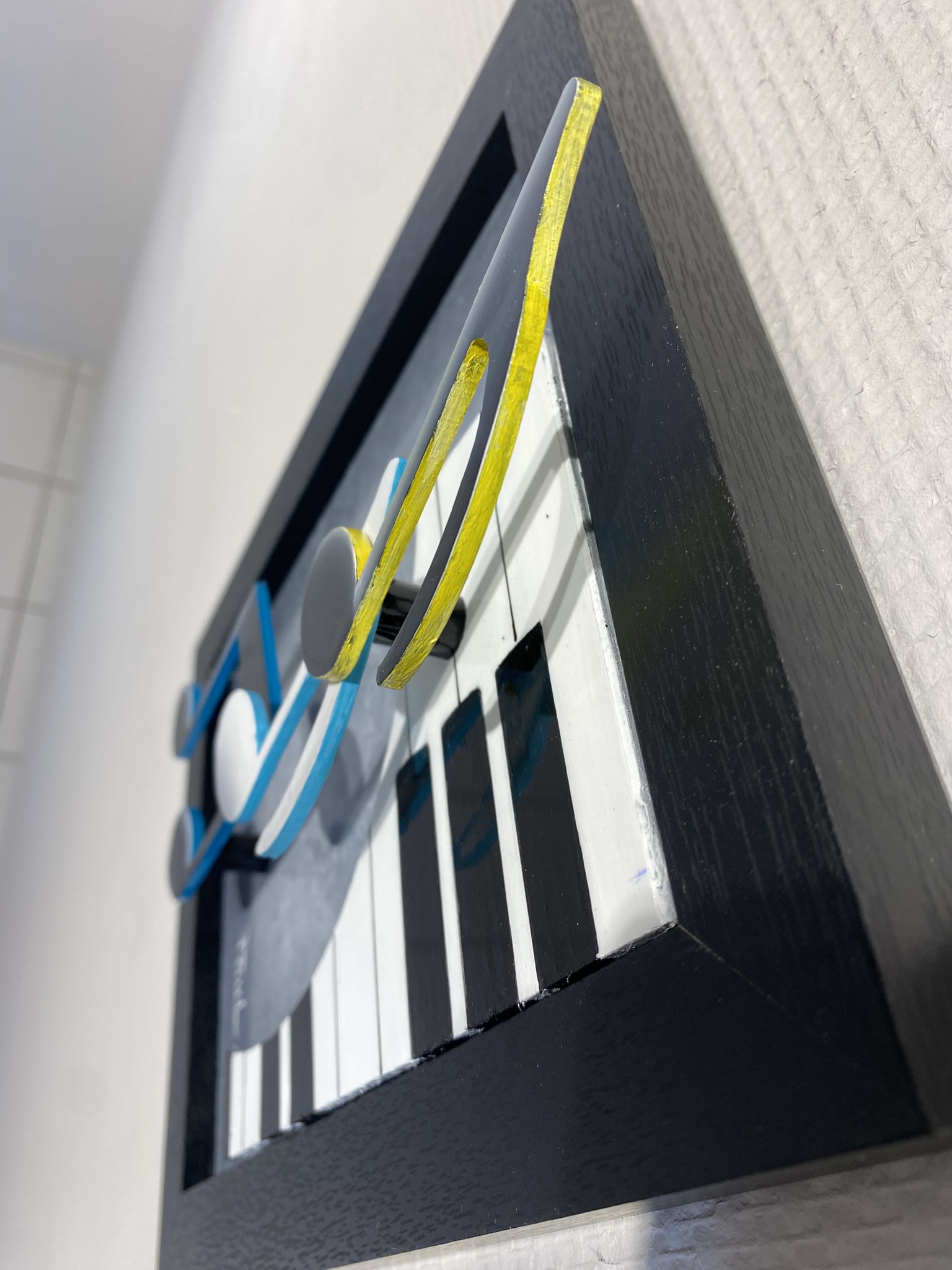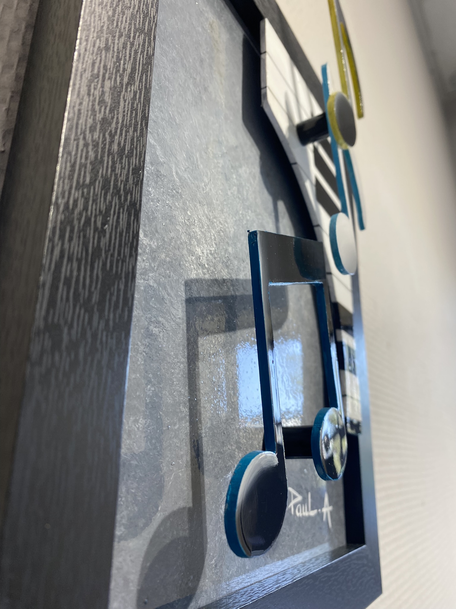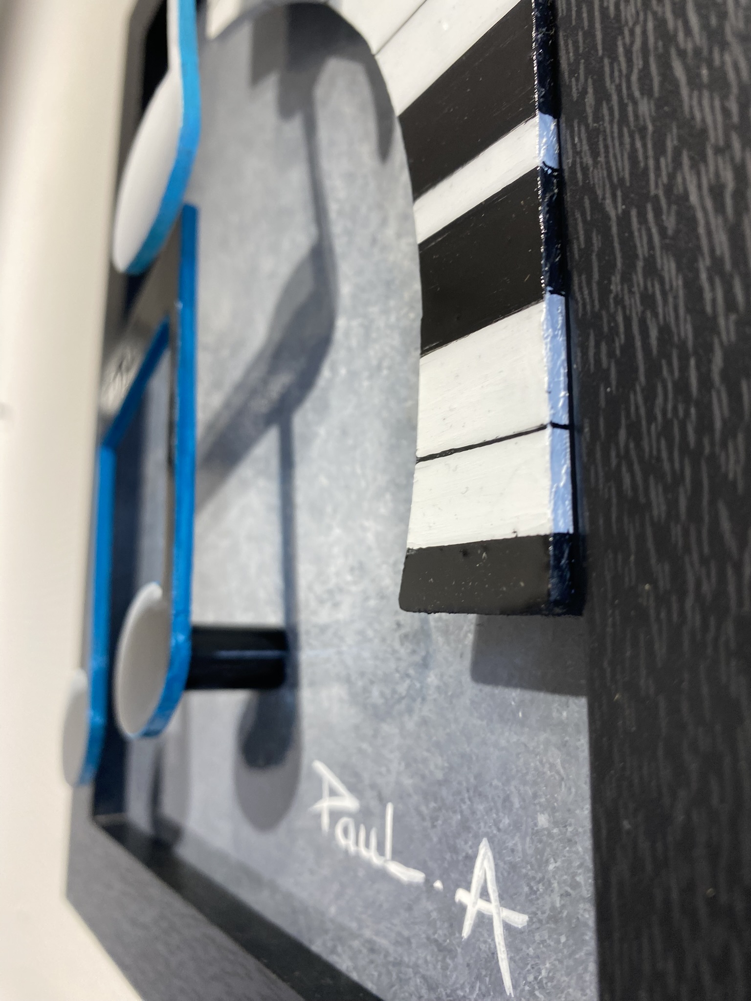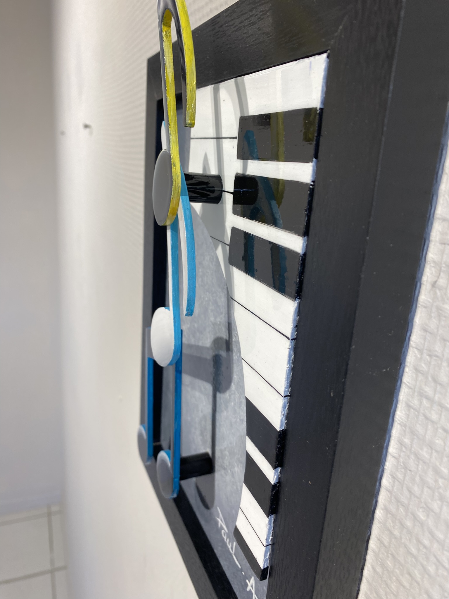 Dans ce petit format, on retrouve une composition dynamique où un clavier stylisé rencontre des notes sculptées en relief.