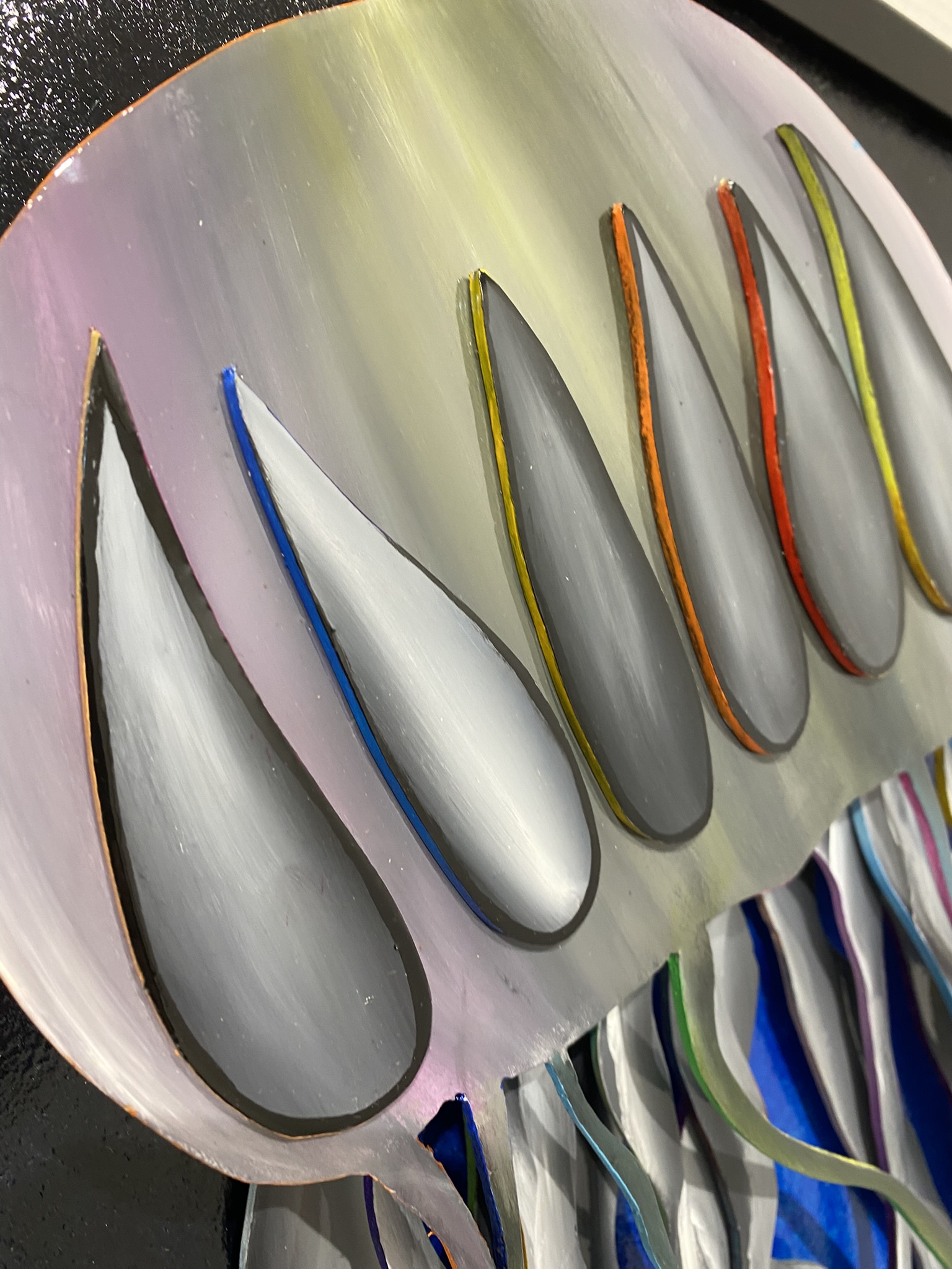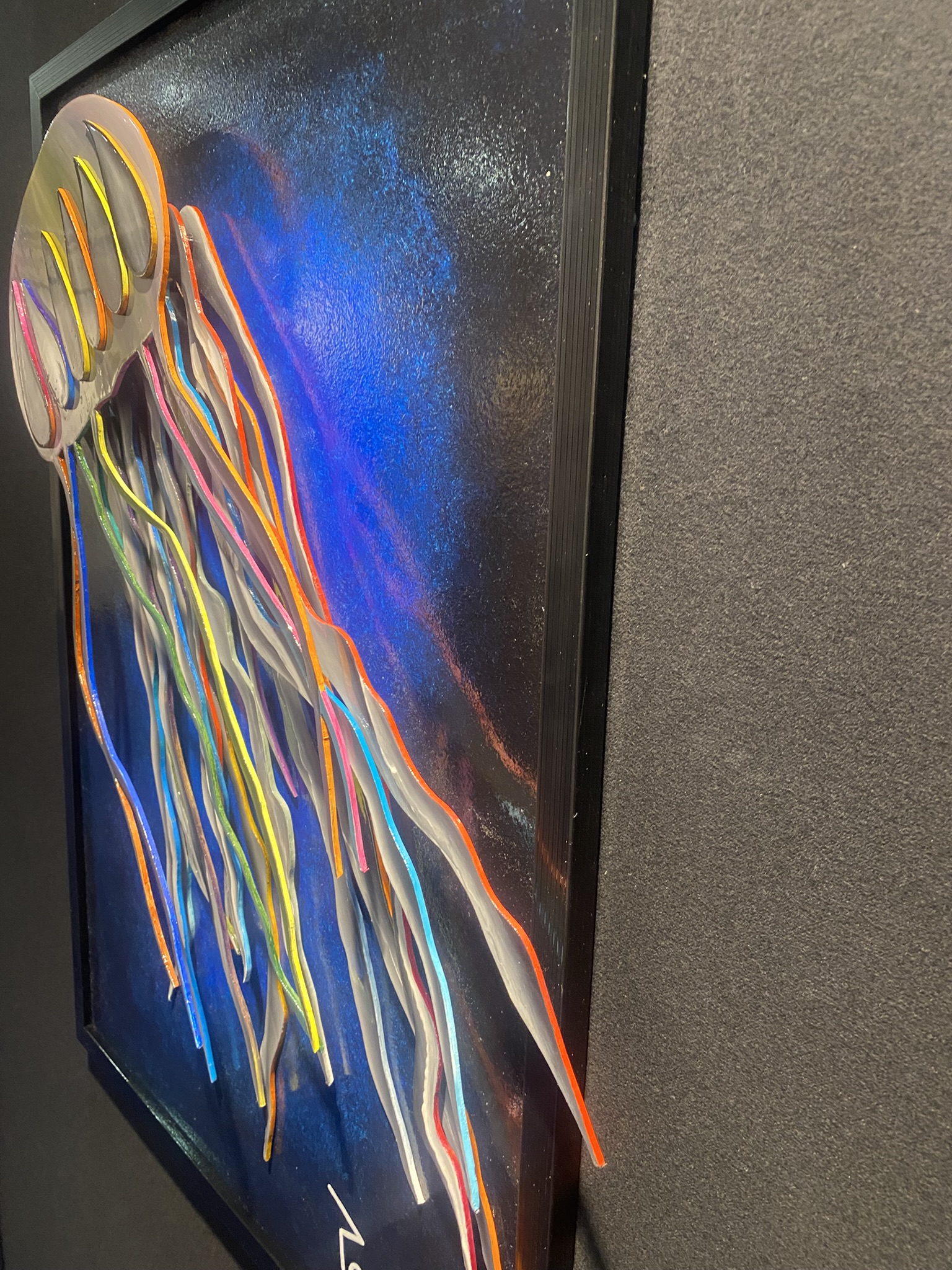 With « Depth, » the silent poetry of the abyss is represented through this embossed jellyfish, with its slender and vibrant forms. The tentacles seem to float out of the frame, as if carried by an invisible current. This physical escape, which has become my signature, reflects the constant desire to break boundaries and invite the eye to go beyond.