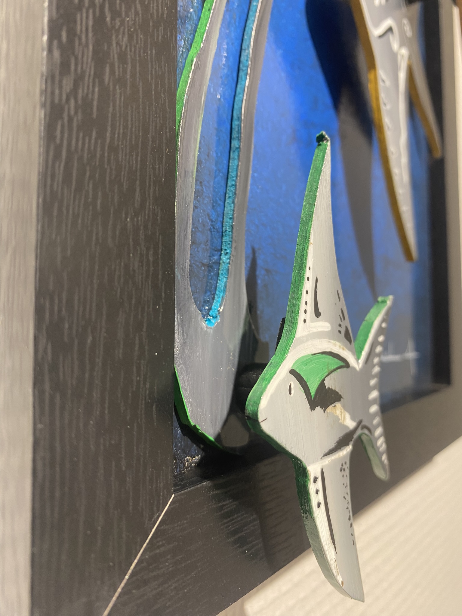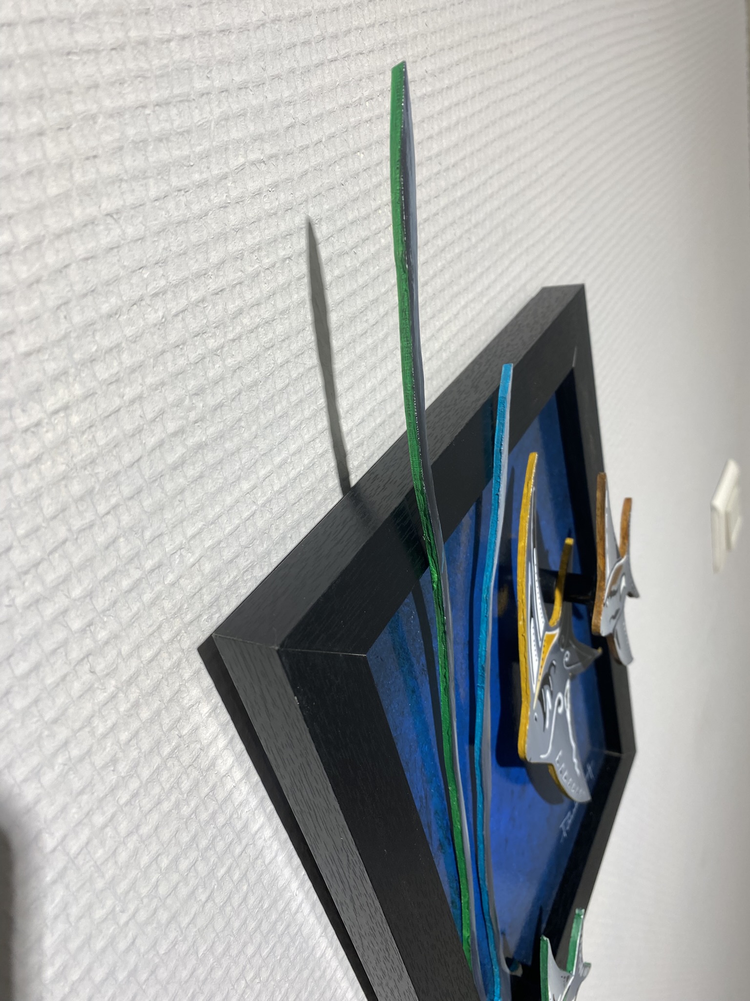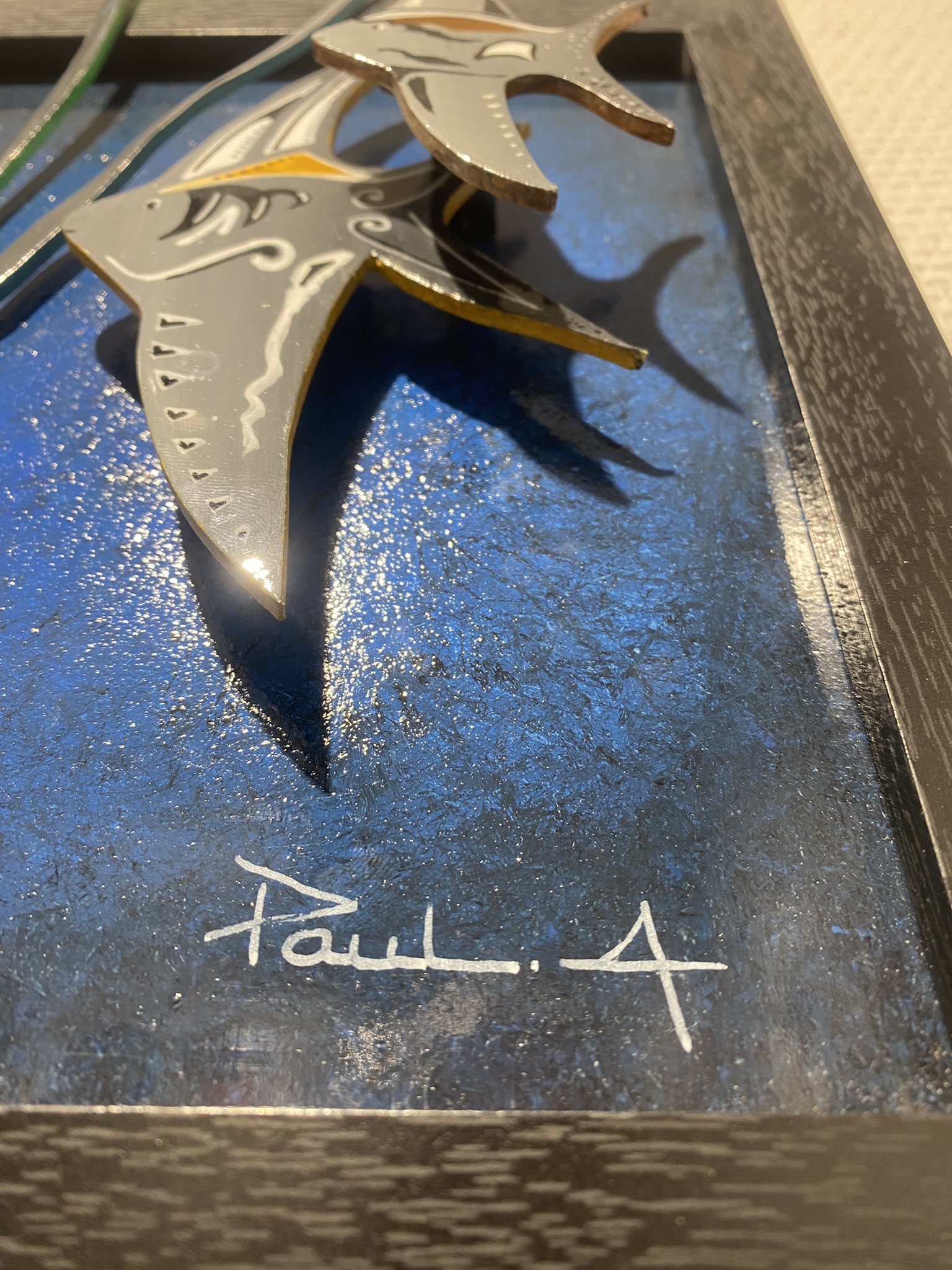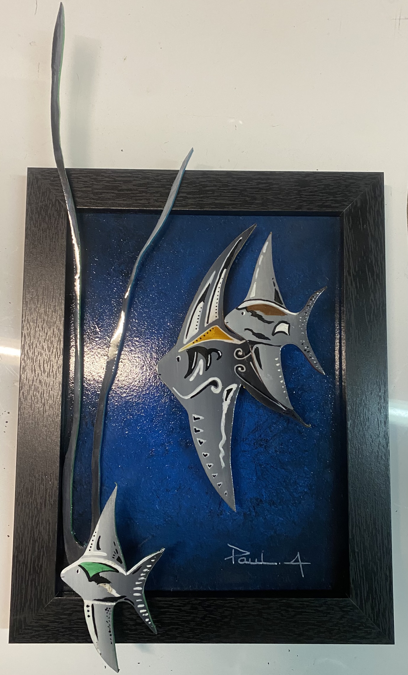 « Sprit Fish » explore la légèreté silencieuse du monde marin à travers ces 3 poissons stylisés qui semblent flotter, presqu’en apesenteur, dans un bleu profond.